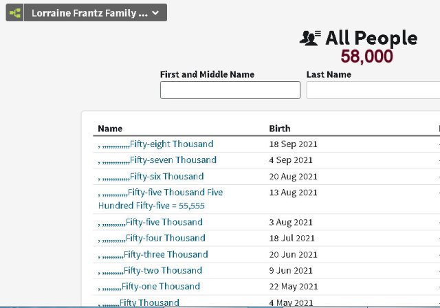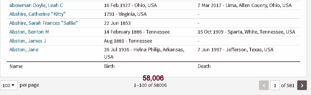 Overly zealous? I missed the round number. I was documenting another obituary and there were children—and siblings—and nieces and nephews. OMG: One thousand individuals added in two weeks!! I “gotta git ‘er done” before someone writes my obituary.
