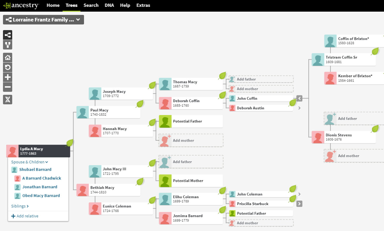 I found a new branch of the tree. When I saw “Lydia Macy” in my “Frantz tree,” I wanted to see if she connected to the Macy’s in my “Coffin tree.” Yes, indeed, I traced her family back to Nantucket Island, Massachusetts. See my Thanksgiving Day blog message for links to my history of those families. This is so fascinating; I can’t walk away!!