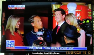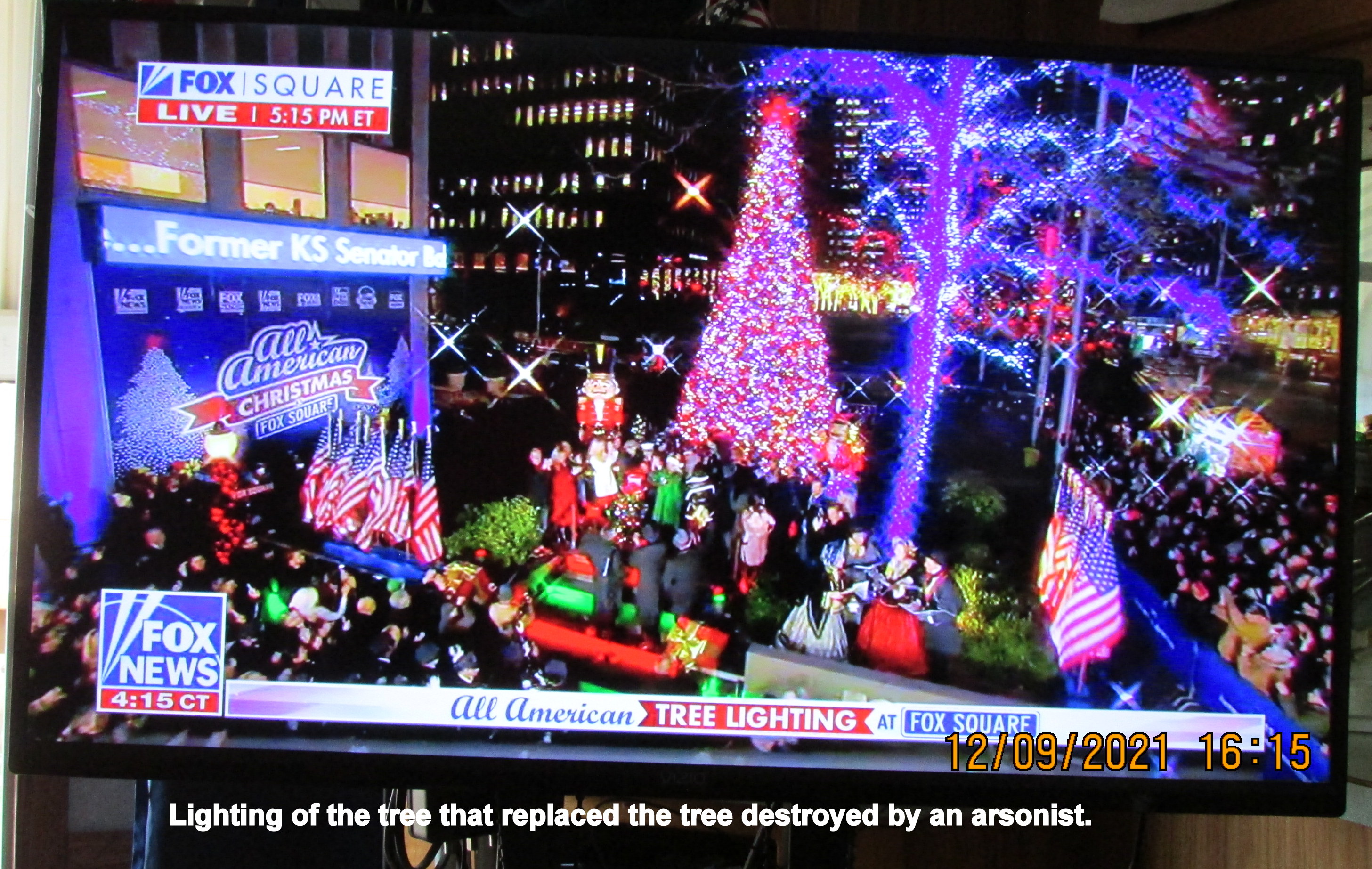Confession: Lorraine respects the information from individuals on FOX NEWS. I rarely watch ABC, CBS, NBC, or the other “leftist” networks. How extremely tragic that a man would destroy the Christmas tree on FOX Square. Almost overnight, the tree was rebuilt, and we watched the lighting this evening. ~~ “We’ll not be defeated.”