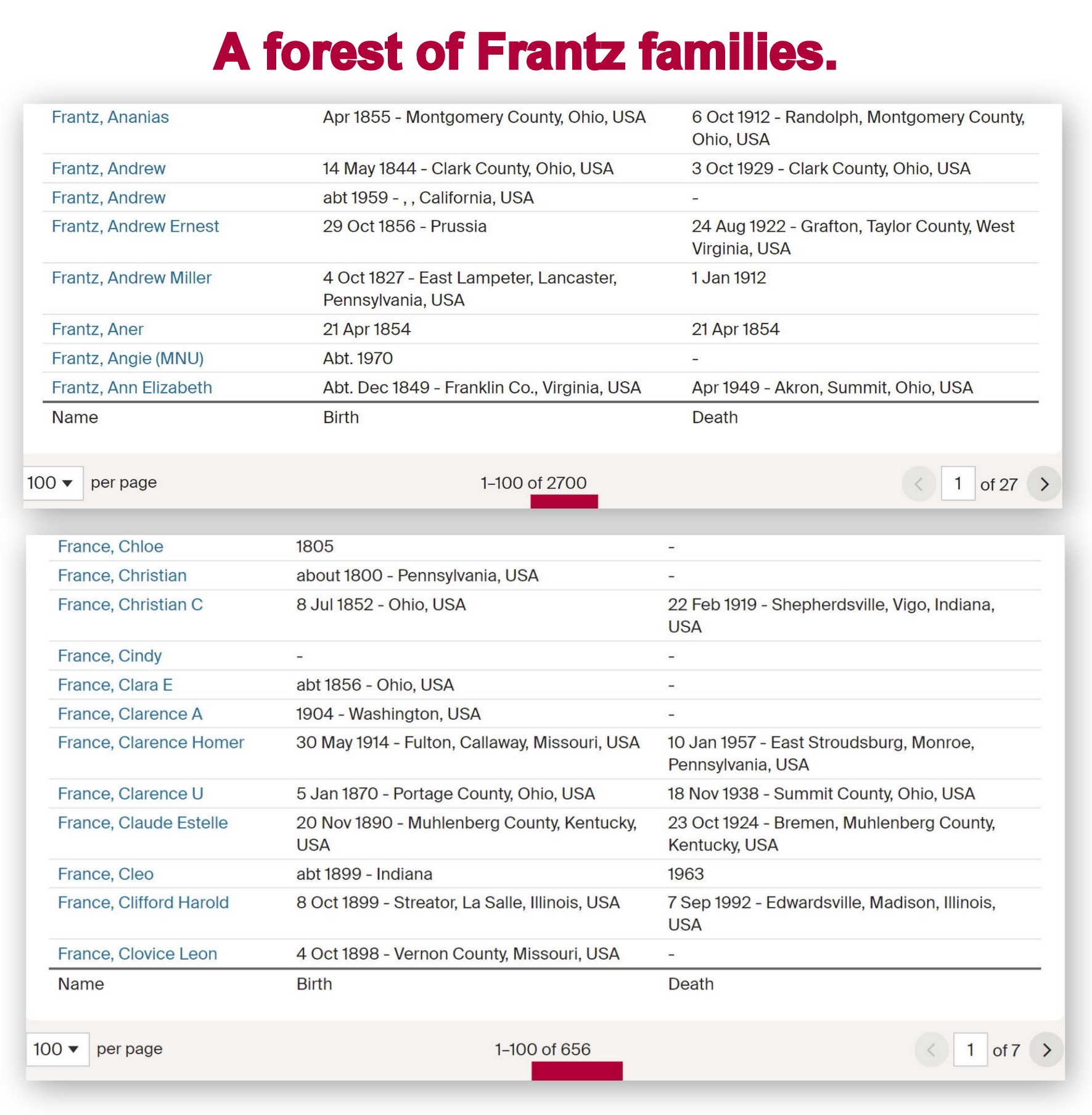 Couldn’t sleep so I have been burning the middle-of-the-night oil. It’s such a waste of time to lay in bed wide awake (IMHO). Observe: Two-thousand-seven-hundred individuals with the “Frantz” surname. Many with the “France” surname are “Frantz” descendants.
