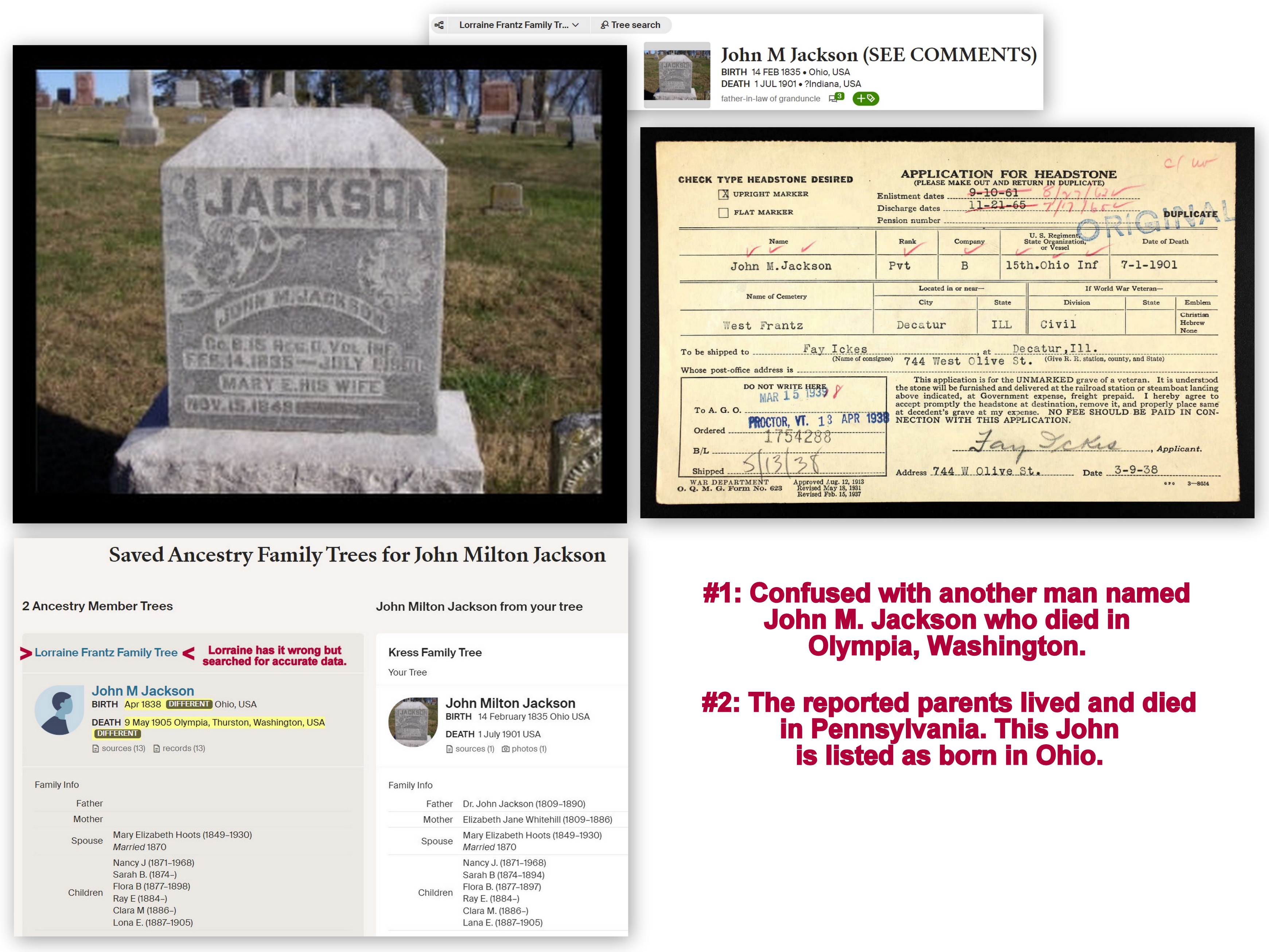 More detective work !! Feb7 by Lorraine Frantz Edwards I was not happy with information I documented yesterday. I’ve just spent four hours searching, and documenting, John M. Jackson. My data is incomplete but (hopefully) obvious errors have been corrected. Share this: Click to share on X (Opens in new window) X Click to share on Facebook (Opens in new window) Facebook Like Loading...