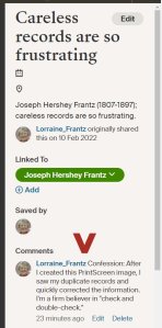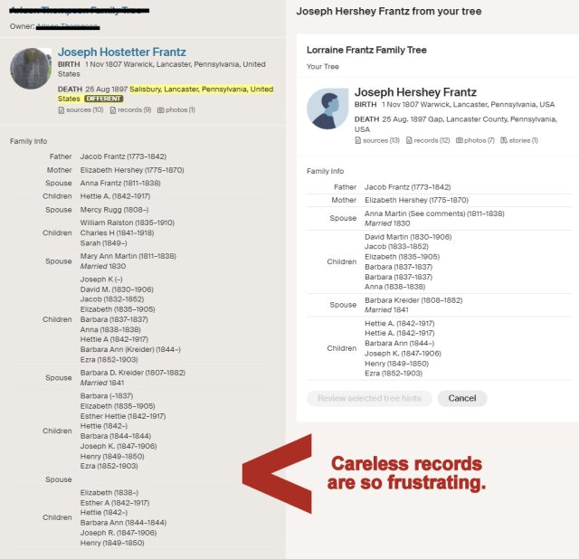 First thing this morning, a new “hint” for a “Frantz” individual (received via email), and I was eagerly, breathlessly searching the records. I added a lot of new “Frantz” and collateral families. I experienced my usual frustration with careless documentation. ~~ Ancestry.com is my good medicine.