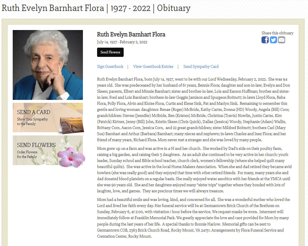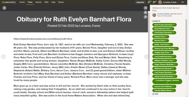 True story: It took all day, yesterday, to document the individuals in this obituary. Beyond the names you see, a multitude of extended family members. An obituary is a “gold mine” of valuable information. ~~ I’ll probably spend today on the computer while watching and listening to TV worship services.