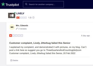 “Lively” takes advantage of customers Feb22 by Lorraine Frantz Edwards See: Customer complaint Lively Jitterbug failed this Senior Share this: Click to share on X (Opens in new window) X Click to share on Facebook (Opens in new window) Facebook Like Loading...