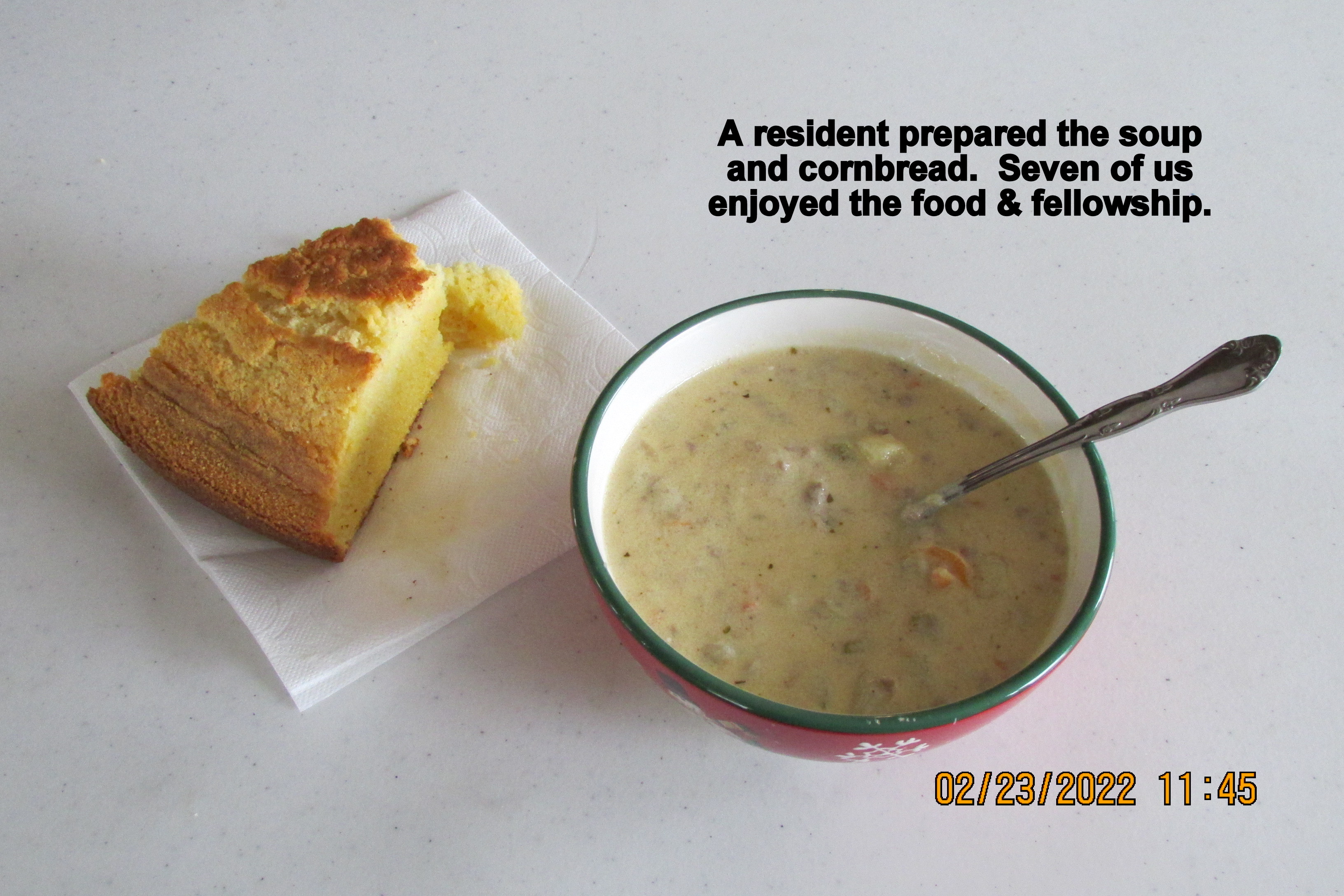 Soup, cornbread & enjoyable fellowship !! Feb23 by Lorraine Frantz Edwards I’m quick to tell my out–of–the–area friends (on the phone) that I am living in a little corner of Heaven. The RV Park residents are so kind to me!! Correction: So kind to one another. Share this: Click to share on X (Opens in new window) X Click to share on Facebook (Opens in new window) Facebook Like Loading...