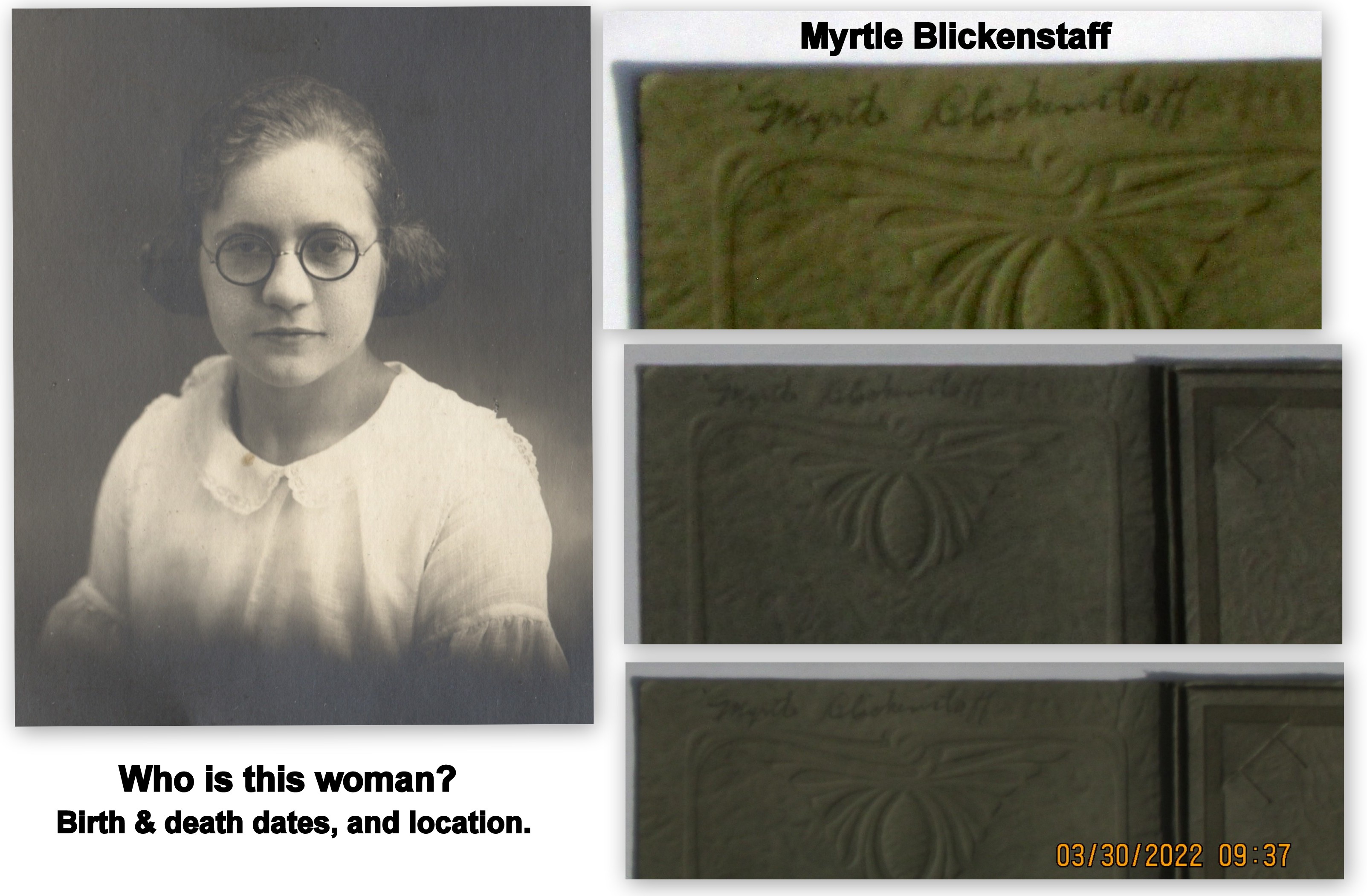 I searched my Ancestry database and the entire Ancestry database–without success. Now “Myrtle Blickenstaff” is a solo name and picture on Ancestry waiting for someone to identify her. “Moments” turned into hours.