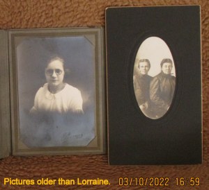 While in an antique mall in Aurora, IL, I picked up a photo of “Lucy Altland, sister of Mattie Blickenstaff” and it contains 2 women. Judging by the photos of Mattie Burgard Davis Blickenstaff in your tree, I’d say one of the women is definitely her. That makes the other woman Mattie’s sister Lucy Burgard Altland. I bought the picture with the intent of reuniting it with their family. According to your Lorraine Frantz Family Tree, you’re their family. If you’d like the photo–free, tell me where to snail-mail it and it’s yours. I hope to hear back from you soon.