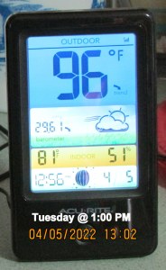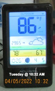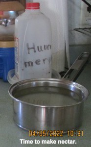 Year after year, I’ve been prepared for the Hummingbirds. Ahead of their arrival, I’ve checked the migration patterns. Yesterday, a Hummingbird checked the area where feeders usually hang, and no feeder. I saw the little bird and said “OMG, I forgot.” This morning, I saw another… and it prompted me to make nectar. ~~ It’s a beautiful Spring day, I should be working in the yard!!