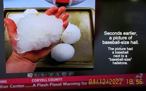 “Golf ball size hail” Apr12 by Lorraine Frantz Edwards . . . . Share this: Click to share on X (Opens in new window) X Click to share on Facebook (Opens in new window) Facebook Like Loading...