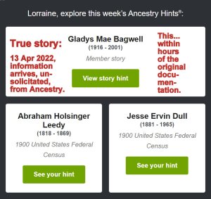 Information for my “extended family” arrives unsolicited. (Yes, I misspelled the word in the image.) I spend days searching—unsuccessfully—for information regarding “Mr. Red’s” ancestry. Ancestry is constantly surveilling Member Family Trees. That’s why “they” know what I have been researching and documenting. Too bad “they” don’t find the information—for Mr. Red—that I’m searching for!