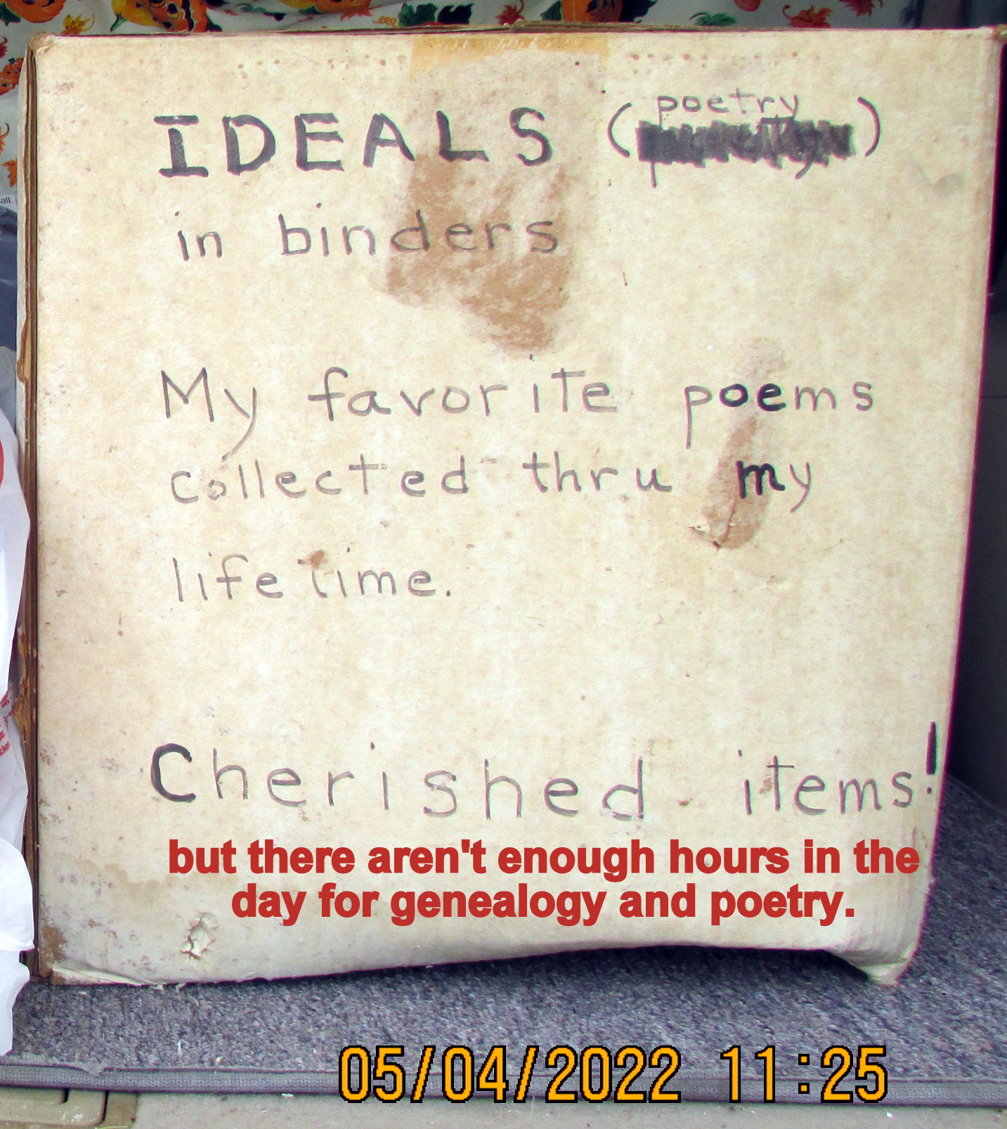 There are several more boxes of poems. At one time, I planned to add the poems to a website, indexed by topic. I love poems of faith but haven’t the time (or energy) for everything on my “to do” list. Now, time and energy must go into downsizing!! These… and more with go to the local library for their fund-raising book sale.