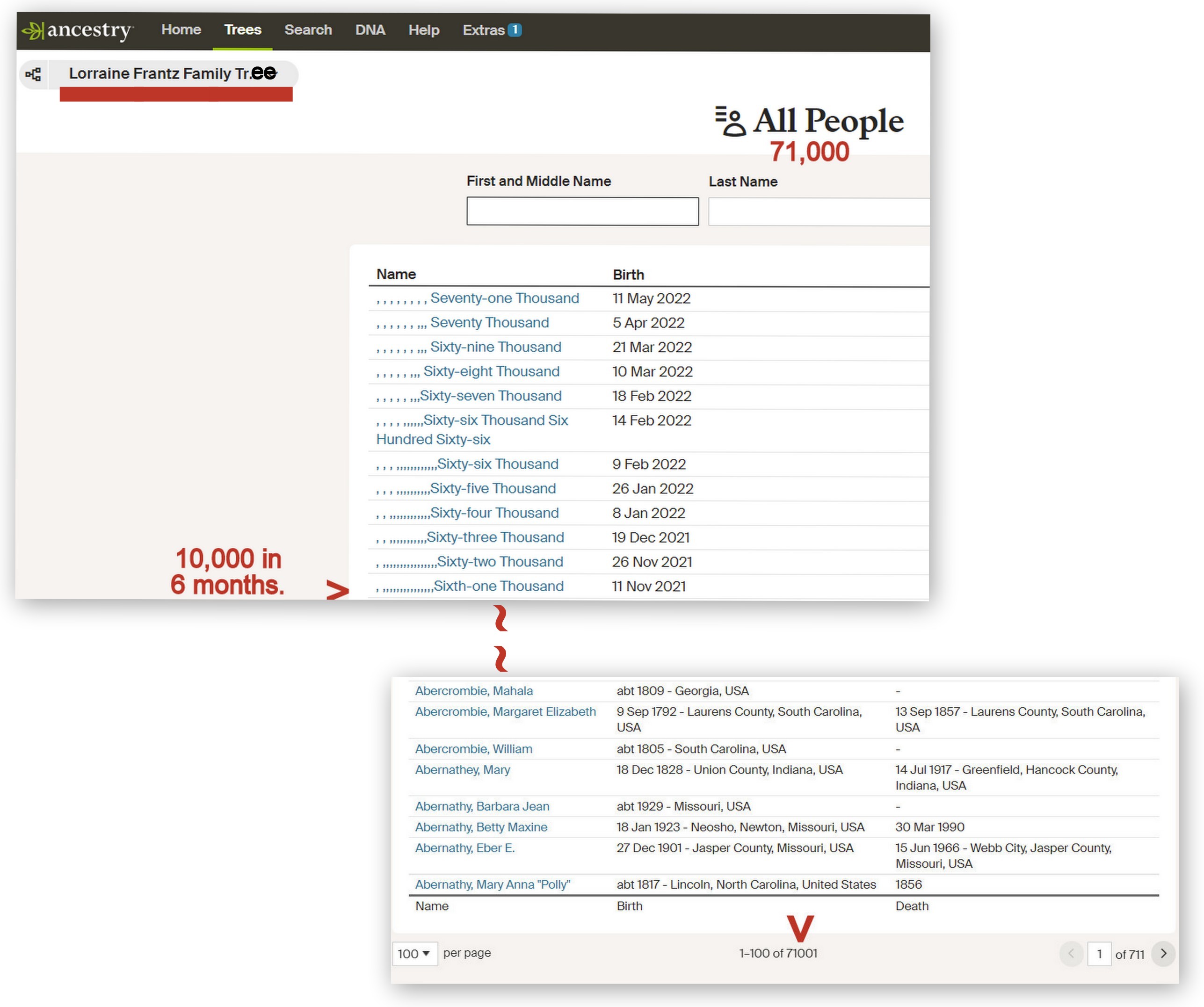 I worked in the carport until it was “too hot.” Then I fell victim to an old habit—the old addiction!! Yes, I started “climbing the family tree.” I was shocked to see that I added one-hundred-twelve individuals… The new folks were added to family members already documented in my tree. Conservatively, each individual—new and previously documented—received five “sources.”