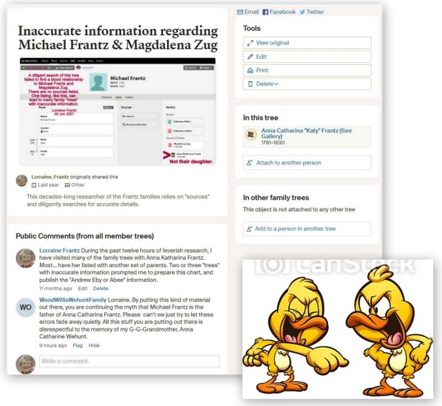 POSTSCRIPT: Hindsight, an afterthought, etc, etc., at twelve noon. (There isn’t anything wrong with my memory; my “recall” is slow.) Rita–the complainer—has my email address and could have written directly to me and not attach eight complaints to individuals in my tree. Rita has a “private” tree and does not share her information. Lorraine has a “public” tree (71,816 individuals) and gladly shares her thirty-five years of research. Read an earlier narrative.