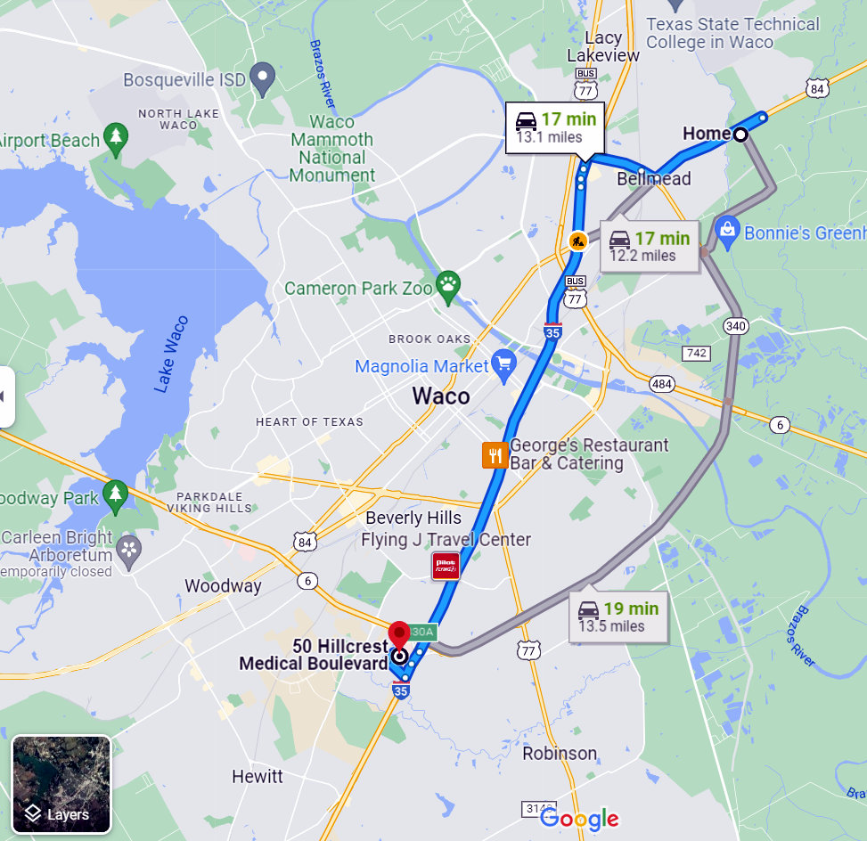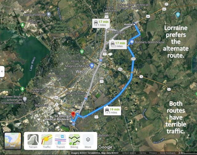 The cardiologist doctor’s offices are “clear across town.” Waco traffic is a nightmare and I am terrified to drive beyond my comfort zone (see map). “They” have me scheduled for an appointment on Tuesday morning and I am terrified at the prospect of that trip. True story: You could not pay me to drive on Interstate 35!! “The 340 Loop” has heavy traffic because drivers want to avoid I–35. I’m requesting your prayers and thinking–of–you–thoughts.