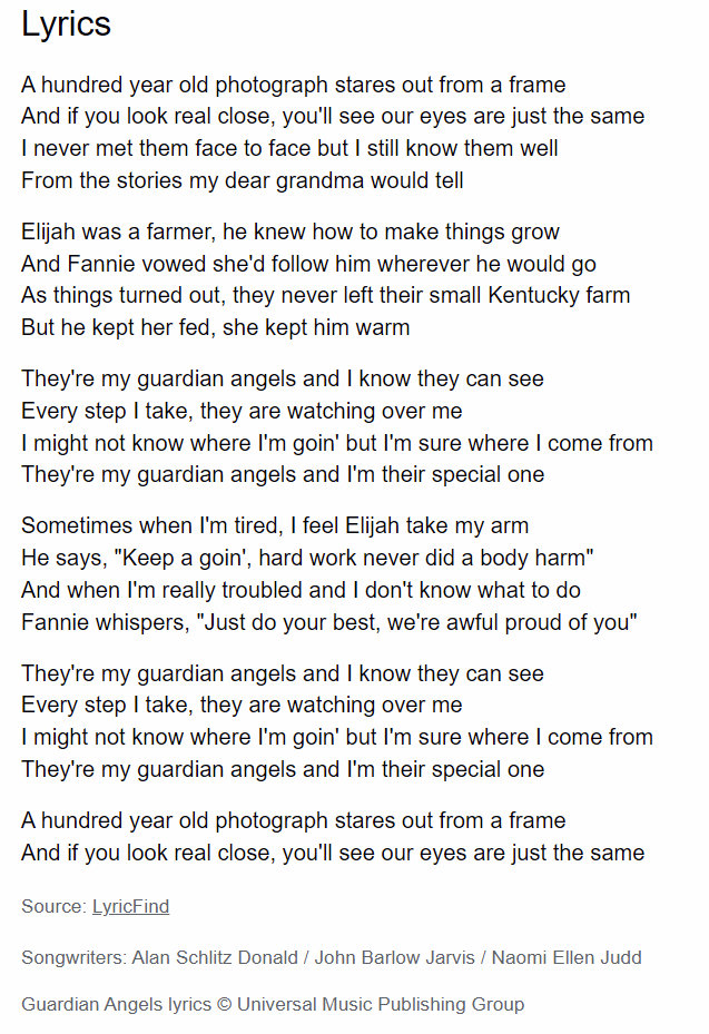 Guardian Angels Aug3 by Lorraine Frantz Edwards New to me: Guardian Angels by Naomi and Wynonna Judd. In an email message, a dear friend sent the link to the song. My friend said it’s a good song for genealogists. I won’t get on my soapbox and dispute some of the sentences. I know where I’m going, Heaven, and “I’m sure where I come from.” Share this: Click to share on X (Opens in new window) X Click to share on Facebook (Opens in new window) Facebook Like Loading...