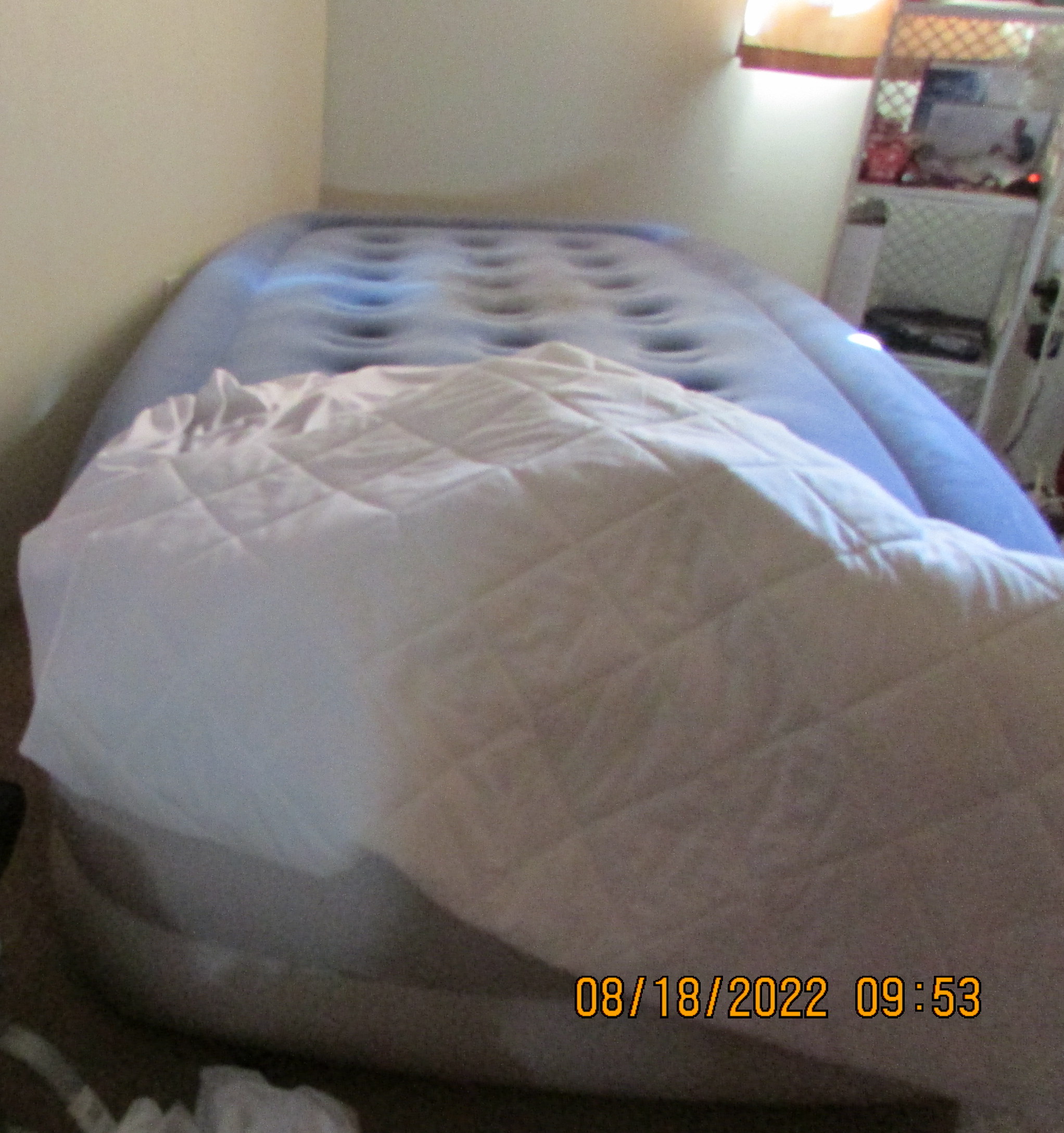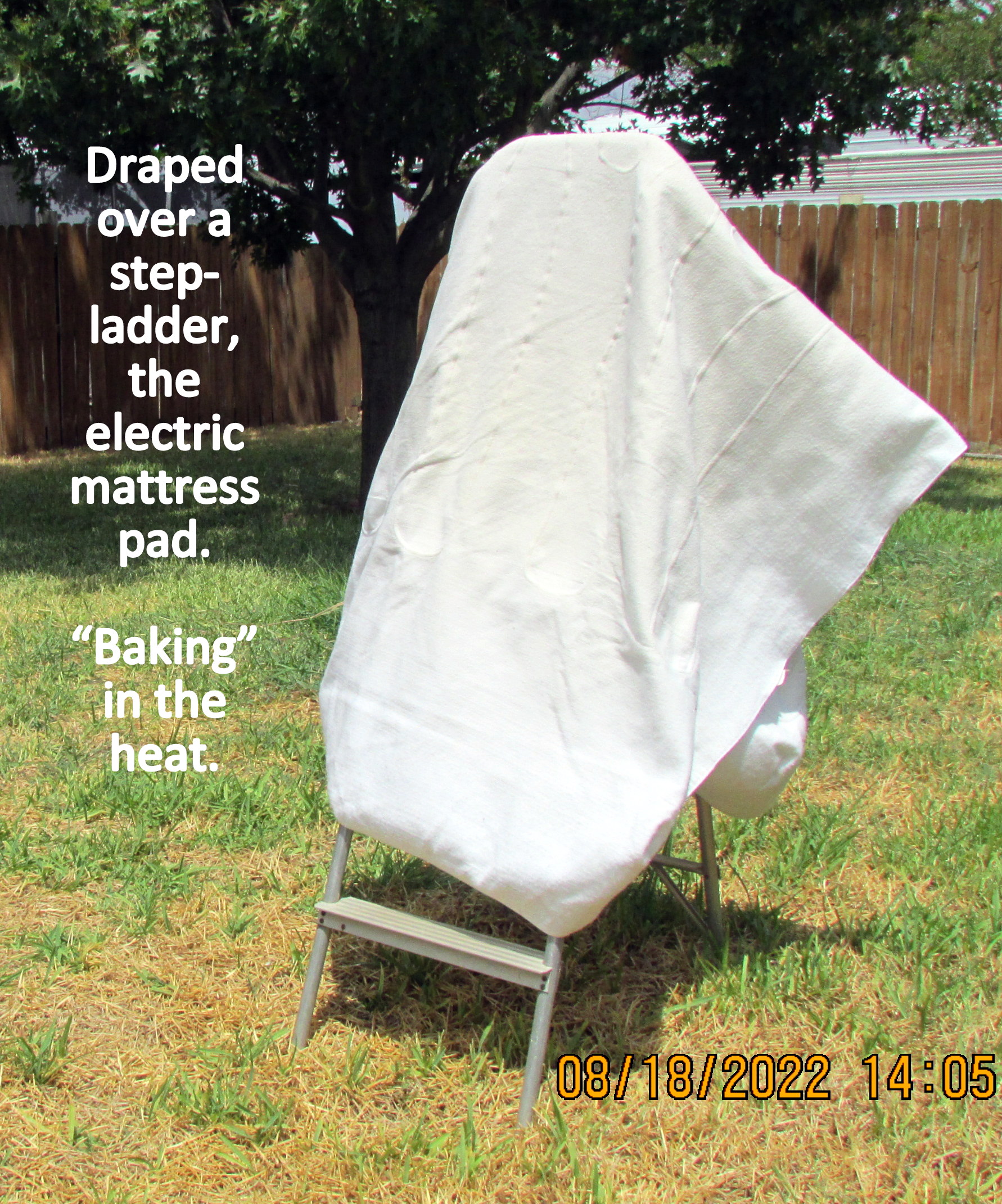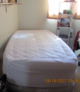 The weather is slightly cooler, praise the Lord!! Lorraine is feeling better, praise the Lord!! Reinforced with Tylenol, a project was tackled: Strip the bed and wash the bedding in hot water, and dry in a hot dryer.