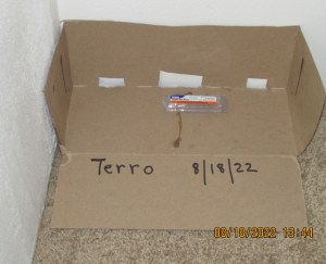 Postscript @ two o’clock: Extra precaution thanks to lady-friend, Deb. She ordered… and had it mailed to me. This is for “sugar ants” but may attract the teenie–tiny insects?! This is positioned in the corner, on the left side, at the front of the bed.