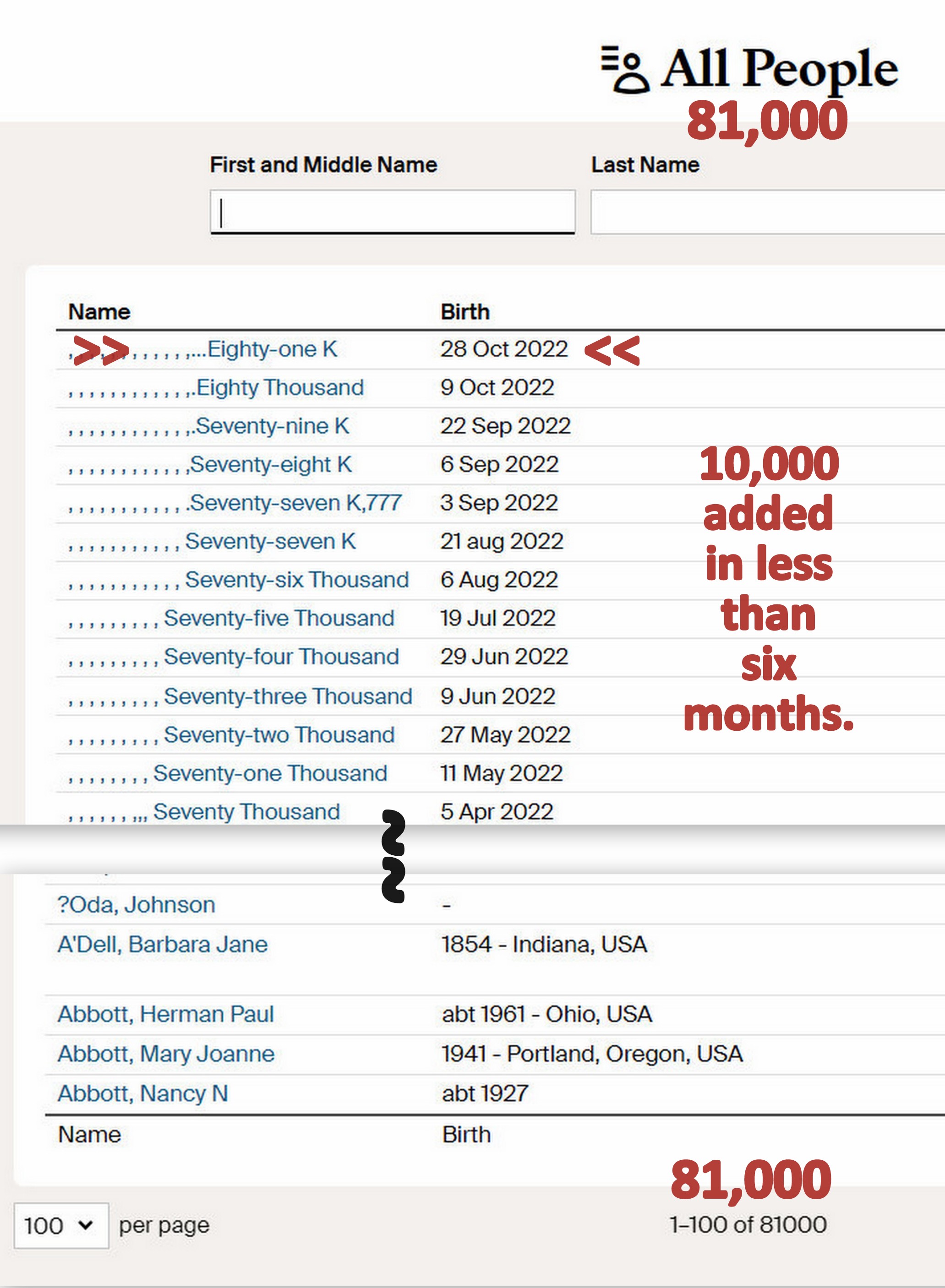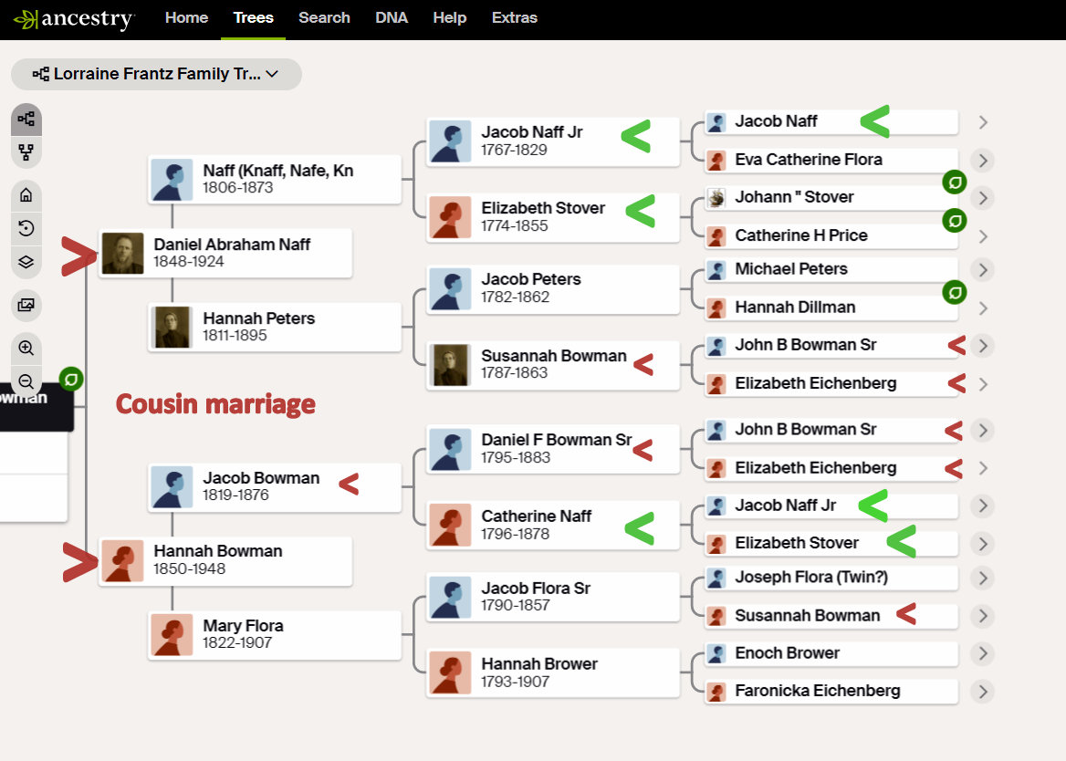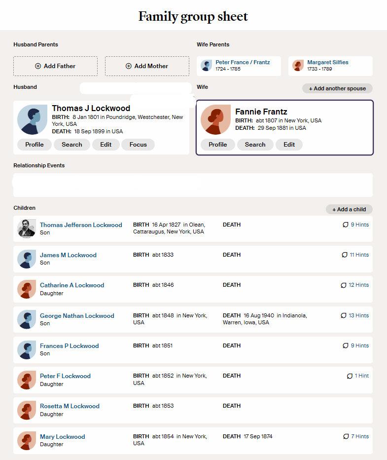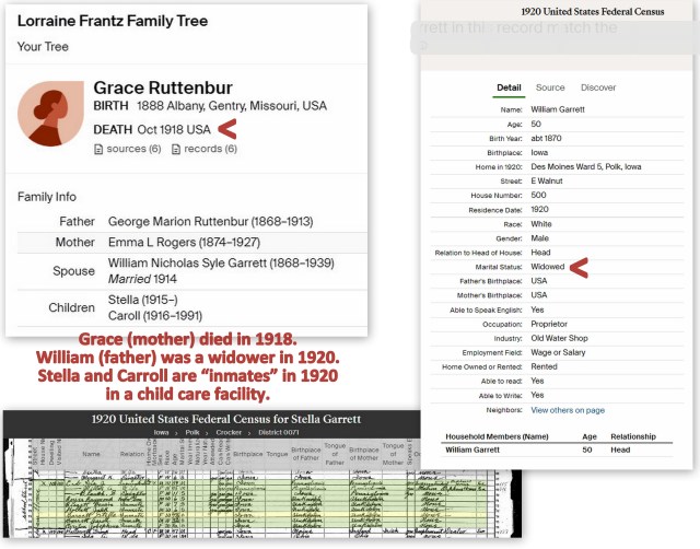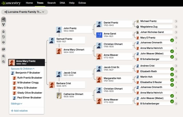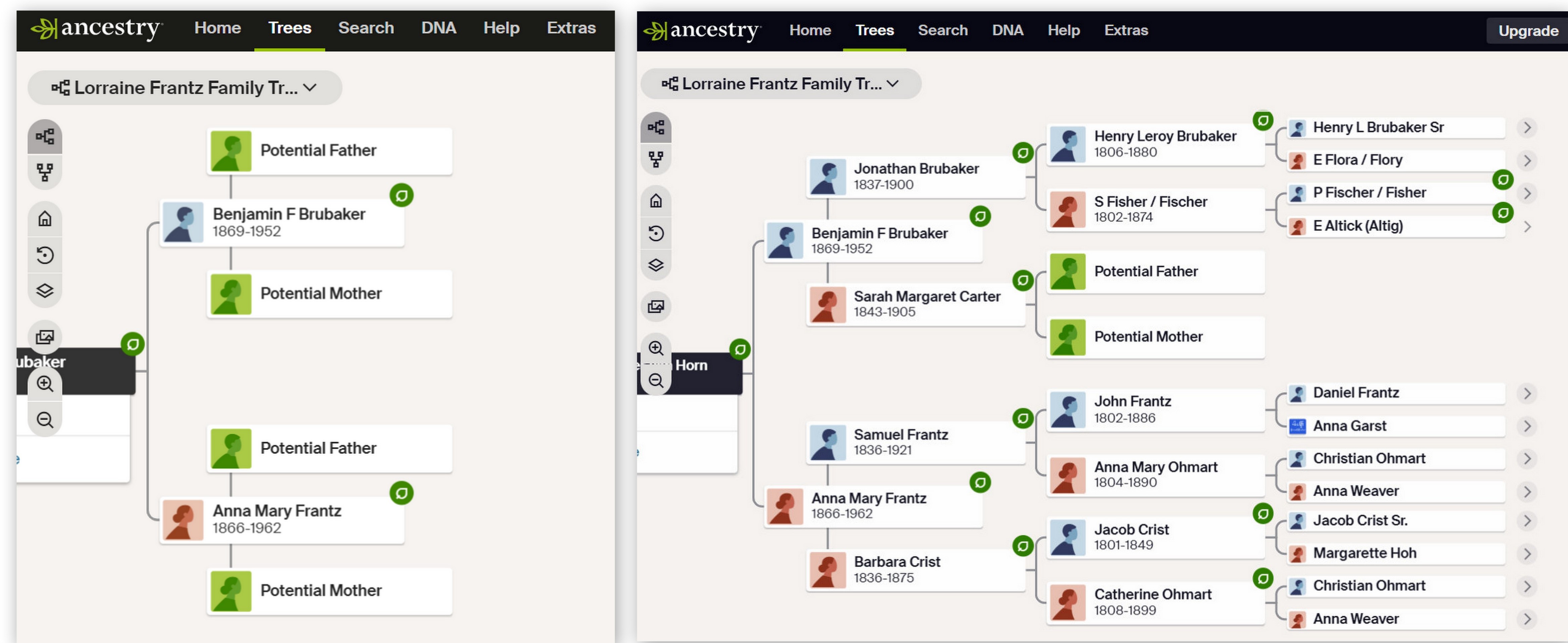 Incredibly, yesterday evening, “out of the blue” I stumbled over the name Anna Mary Frantz. Below, on the left, you see how little information I had. Several hours later, I can display a full–grown tree
