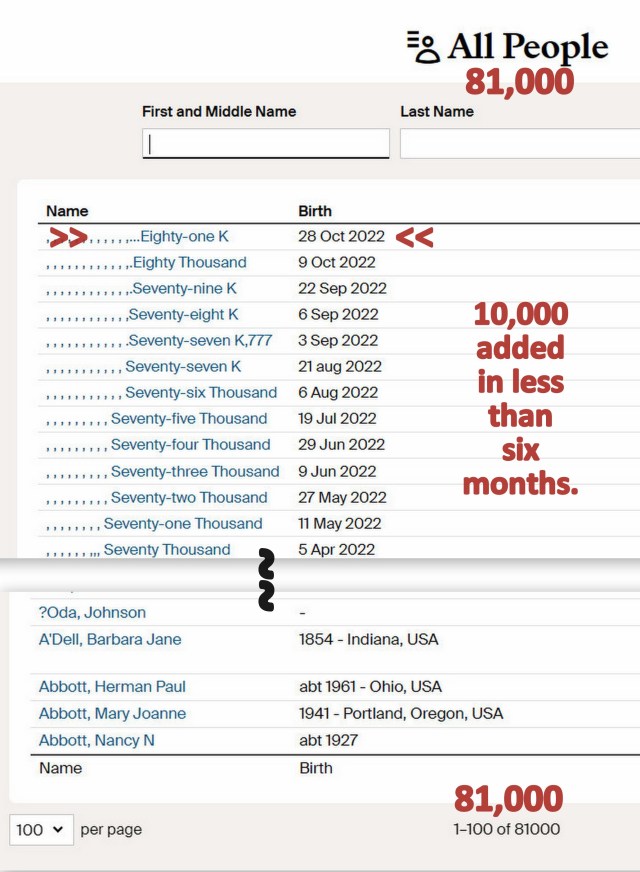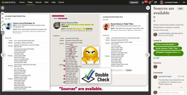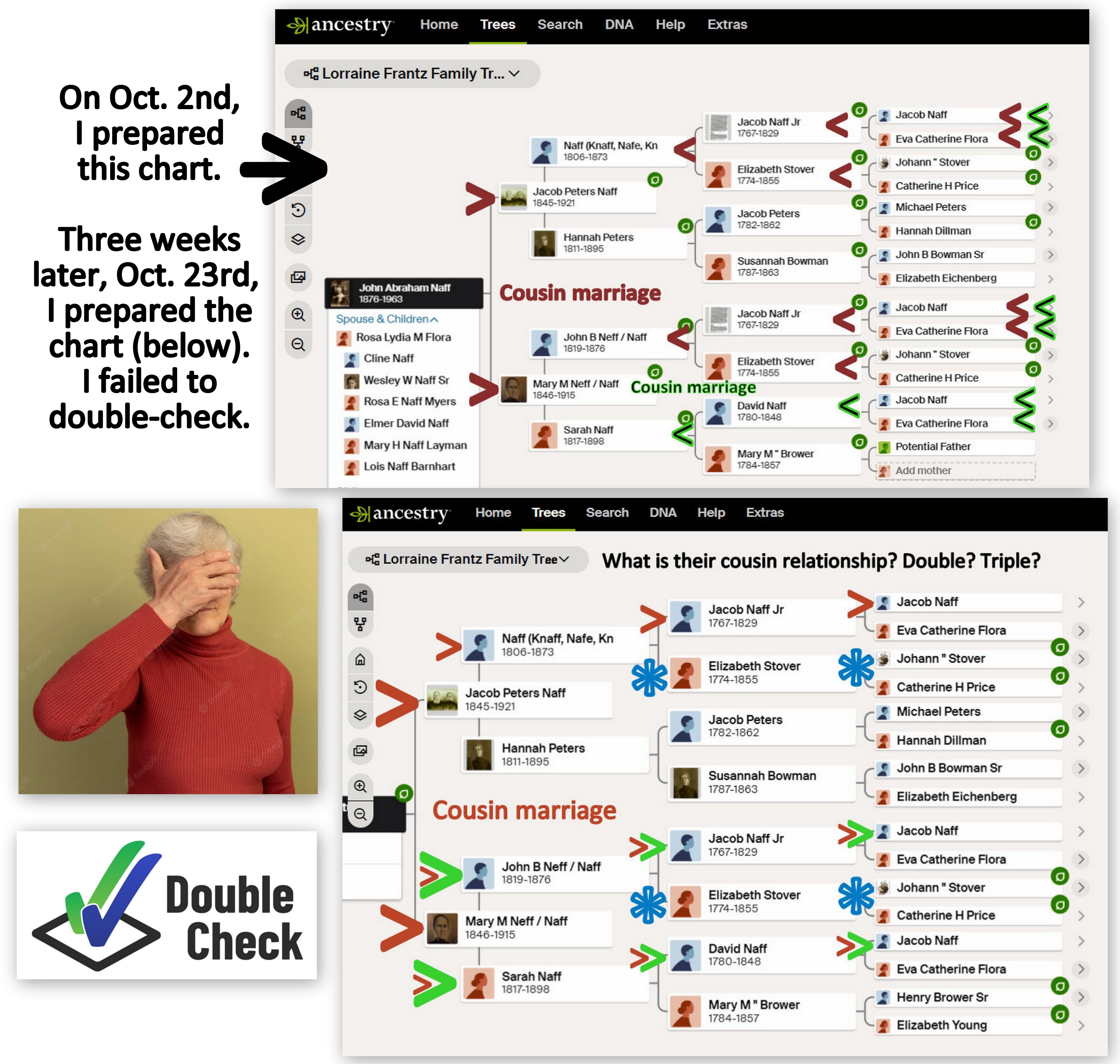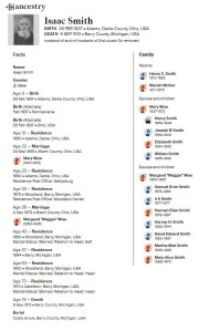 Frequently, I say I aim for 200% accuracy. Today, I observed obvious errors with the Isaac Smith family—in Ancestry Member Family Trees. I spent hours researching and documenting sources. With meticulous care, I prepared the collage (above right) and I was moments from displaying it (in Ancestry) with the identified individuals. I planned to add it to a blog message with a trite remark about spending the day “climbing trees.” After all my documentation, I suddenly recognized my “obvious error.” (Did you spot it?) A couple of hours later, I added the correct information (above left) to other documents for Isaac Smith. (Click the image to enlarge it for easier viewing.)