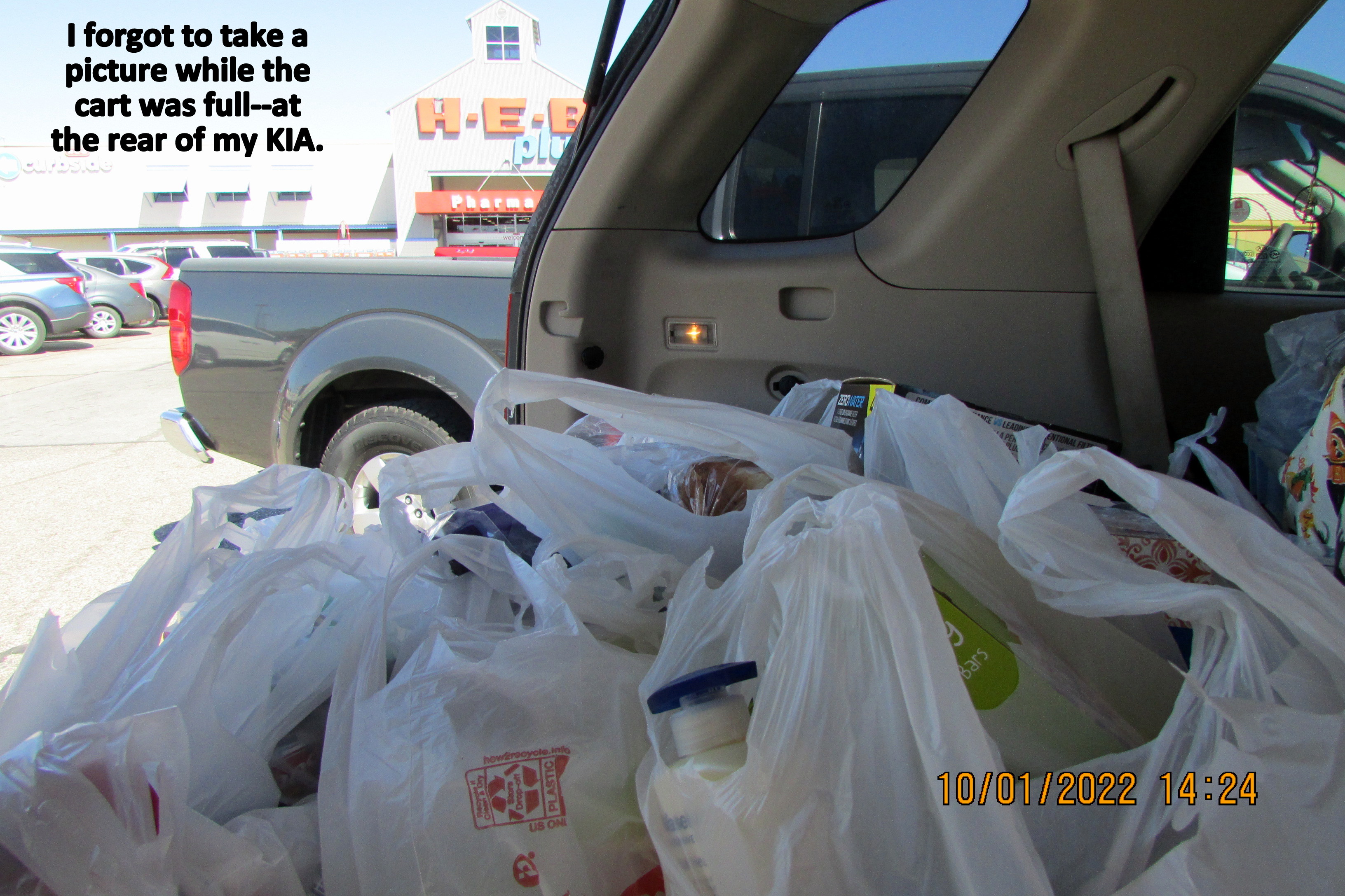 Gospel truth: The last time I did grocery shopping was May 27th. I drove the KIA to the doctor’s office on June 6th and June 10th. No driving in July. To doctor appointments on August 4th, 23rd, and 30th. No driving in September. With today’s trip, I’ve driven eighty-six miles since 1:30 PM, May 27th. ~~ Four hundred miles total since a trip to H.E.B. on January 20th, 2020. Yes, January 20th, 2020.