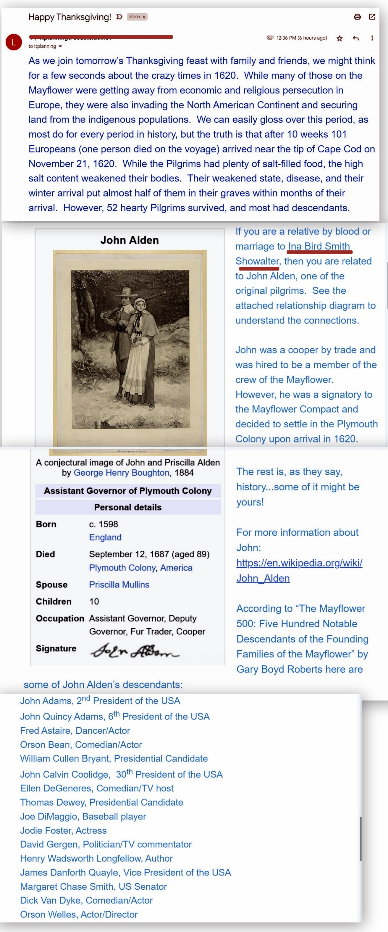 A list of famous descendants of John Alden. A dear friend contacted me with details about her ancestry—and sent the link to a list of famous descendants of John Alden. This topic started with Thanksgiving greetings from a cousin and was discussed in the blog message titled Surprise ancestry information. ~~~~ This winter, residents of the United States may have to experience an austere Pilgrim (or pioneer) lifestyle. Shortages of heating products, etc, etc, but I won’t begin a conversation about political situations. Sincerely, from my heart, “make America great again” is my prayer and not a political statement.