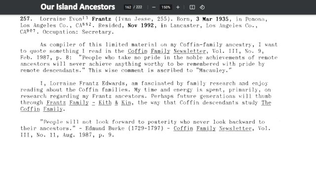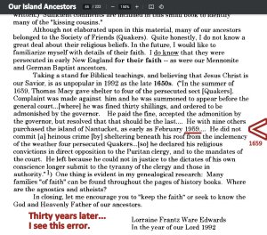This “taste” of history prompted me to review a booklet I prepared thirty years ago. It is titled 1992 Coffin Family Reunion & Our Island Ancestors. Reading it… held my attention all afternoon. Now this lament: I found an error. I am obsessive-compulsive about accuracy. I “proof” time and time again so mistakes don’t find their way into print.