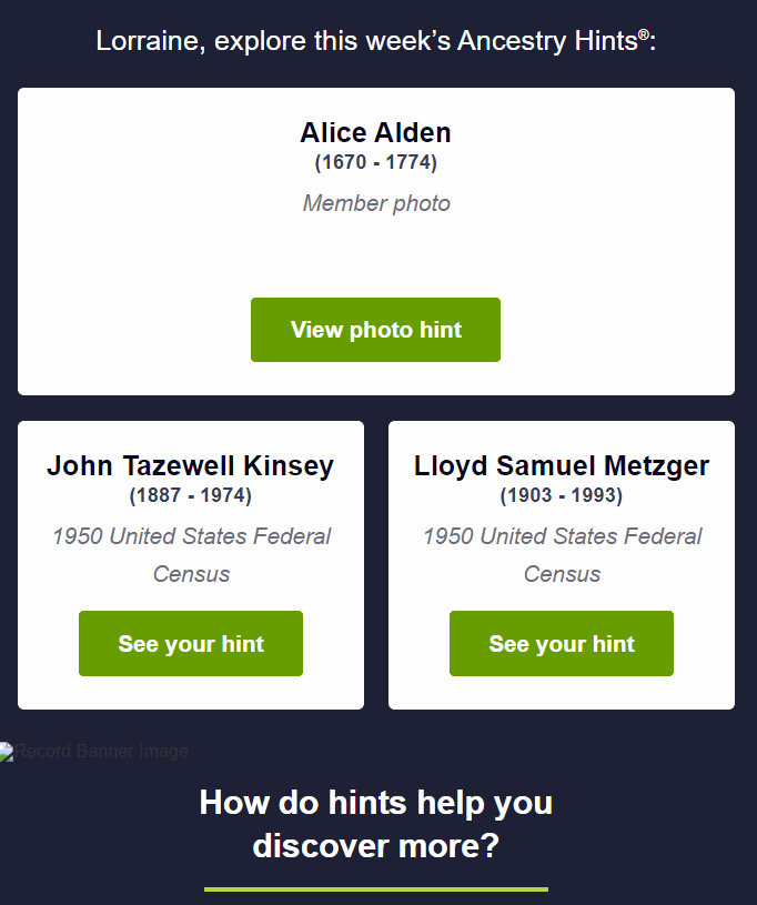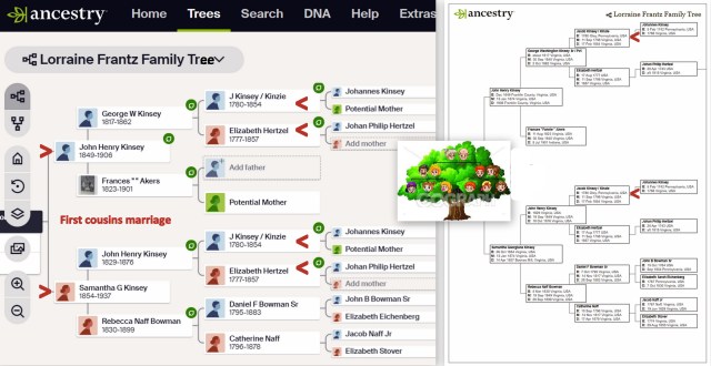 Another morning “climbing the family tree” Dec1 by Lorraine Frantz Edwards The message from Ancestry greeted me first thing this morning. It took all morning to document the hints surrounding those three individuals. Share this: Click to share on X (Opens in new window) X Click to share on Facebook (Opens in new window) Facebook Like Loading...