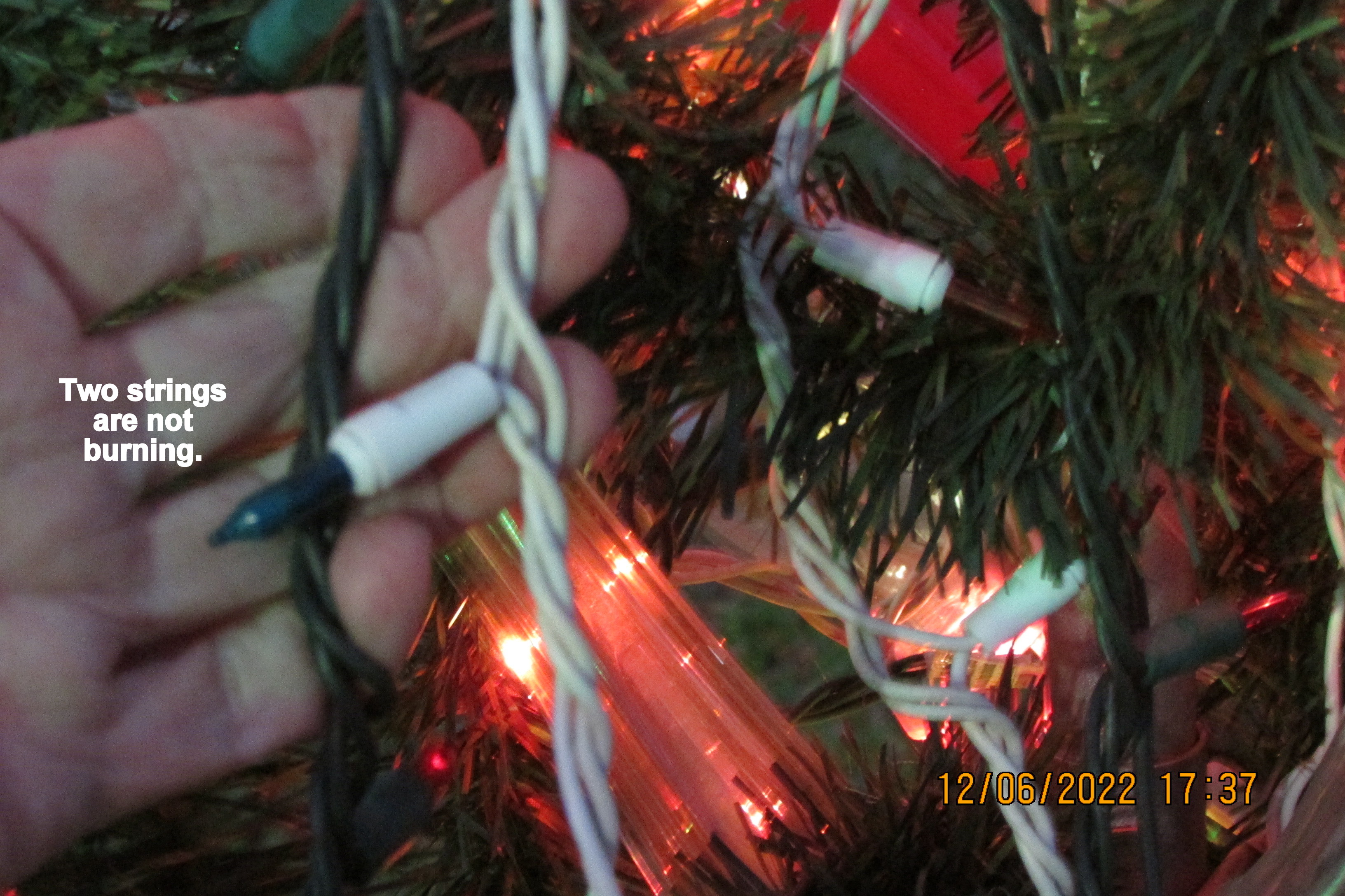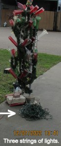 Because two strings of lights failed… and I desire an attractive, well-lit tree, I helped myself to unused lights. Yes, extra RV Park decorations had been packed away (for another Christmas?), and (in my small way) I’m helping to decorate the Park. But decorating the bottle Christmas tree will wait for another day. My energy is empty!