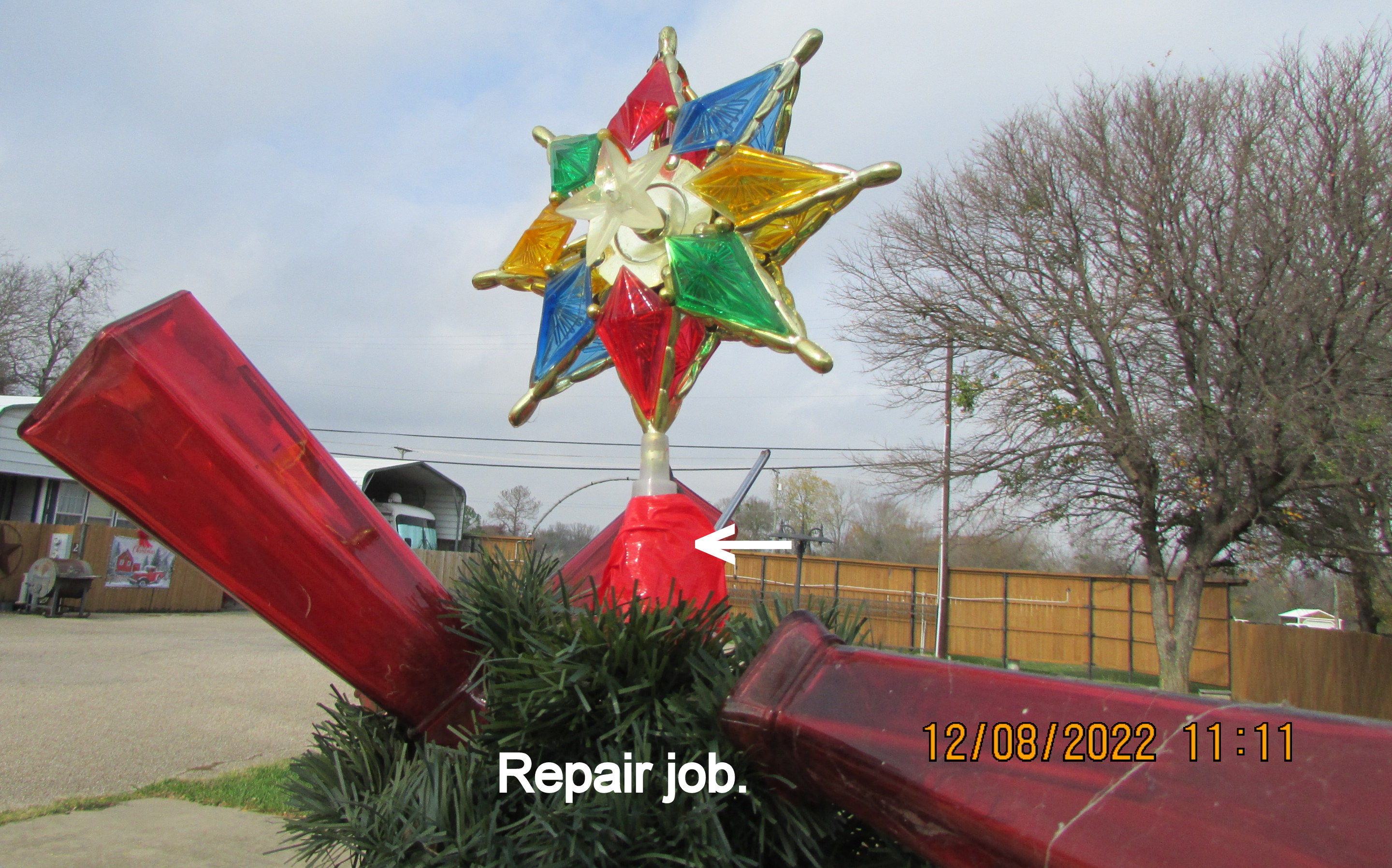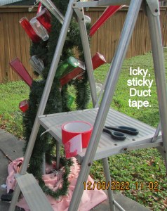 A new package of Duck tape—but several years old. It was almost impossible to unwrap and then I was dealing with “icky-sticky.” The base of the star was broken and needed a repair job.