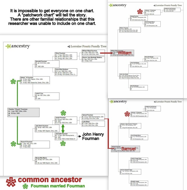 “Detective Lorraine” was challenged by a cousin marriage. My cousin (with funeral home and obituary subscriptions) sent an obituary a couple of days ago. The common ancestor was very difficult to locate. There are several other familial relationships (for later documentation?). See the earlier blog message with information regarding the Fourman family.
