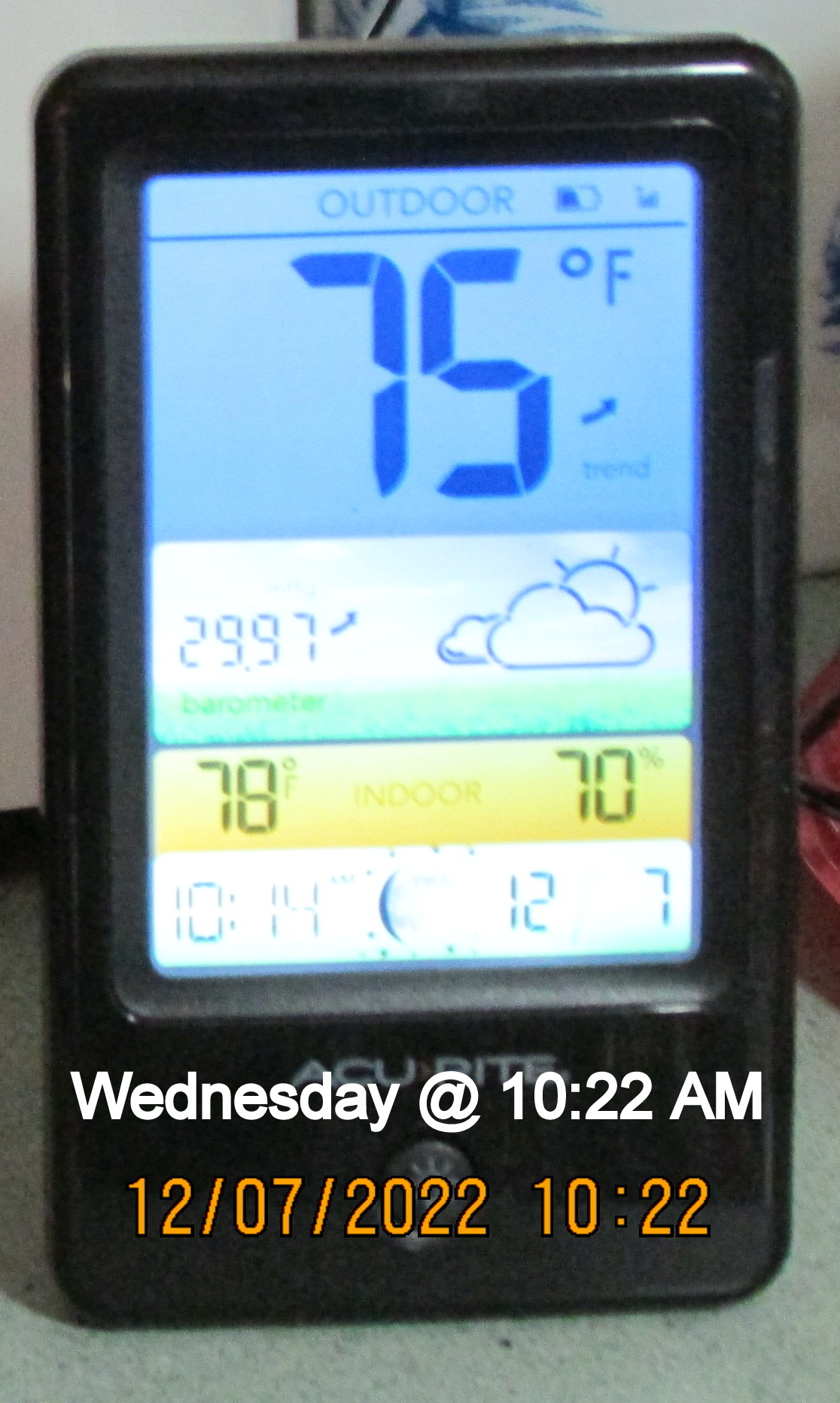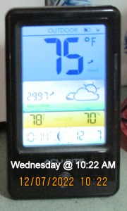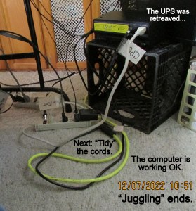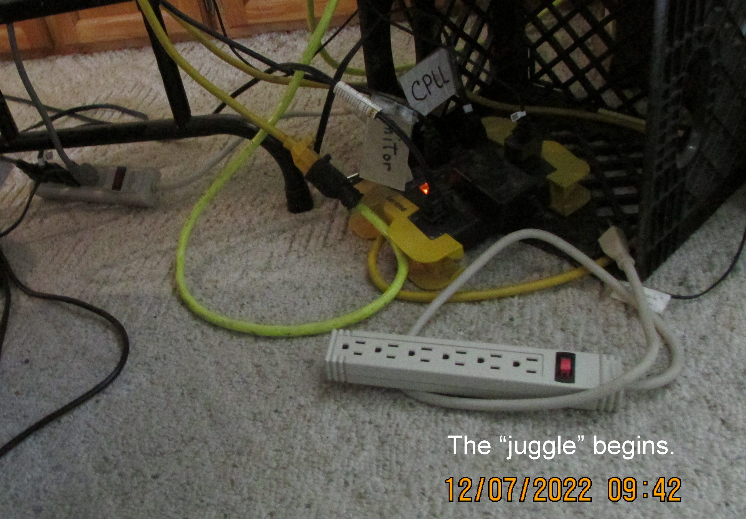 Gratefully, the weather is pleasant so I can work outdoors. I don’t venture outdoors in weather that is too cold, too hot, or too wet. This morning, my discomfort was crawling around on the floor. It is difficult for me to get down and up. ~~ I was “juggling” various electrical items.