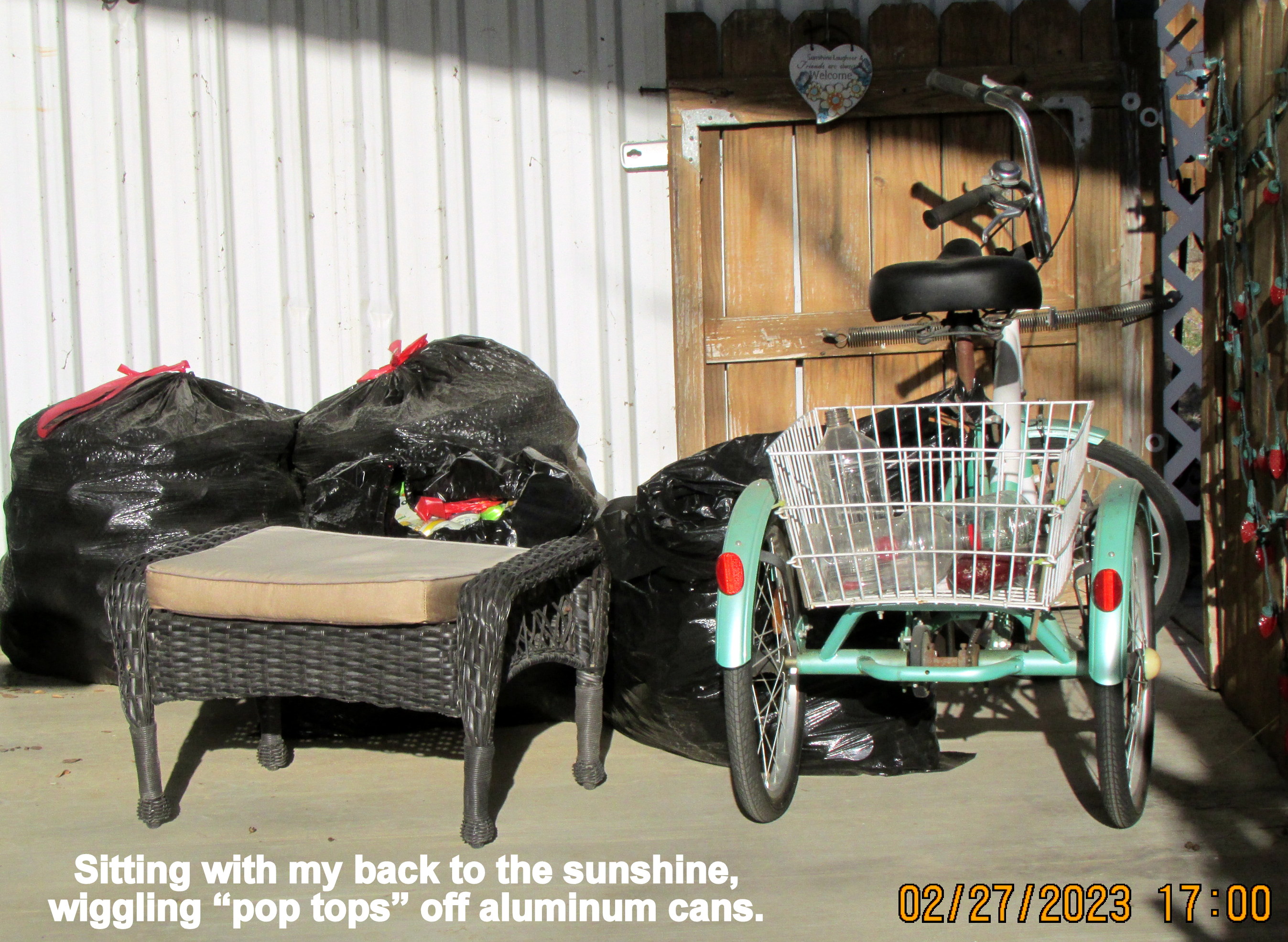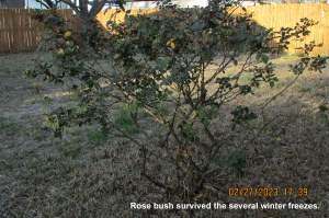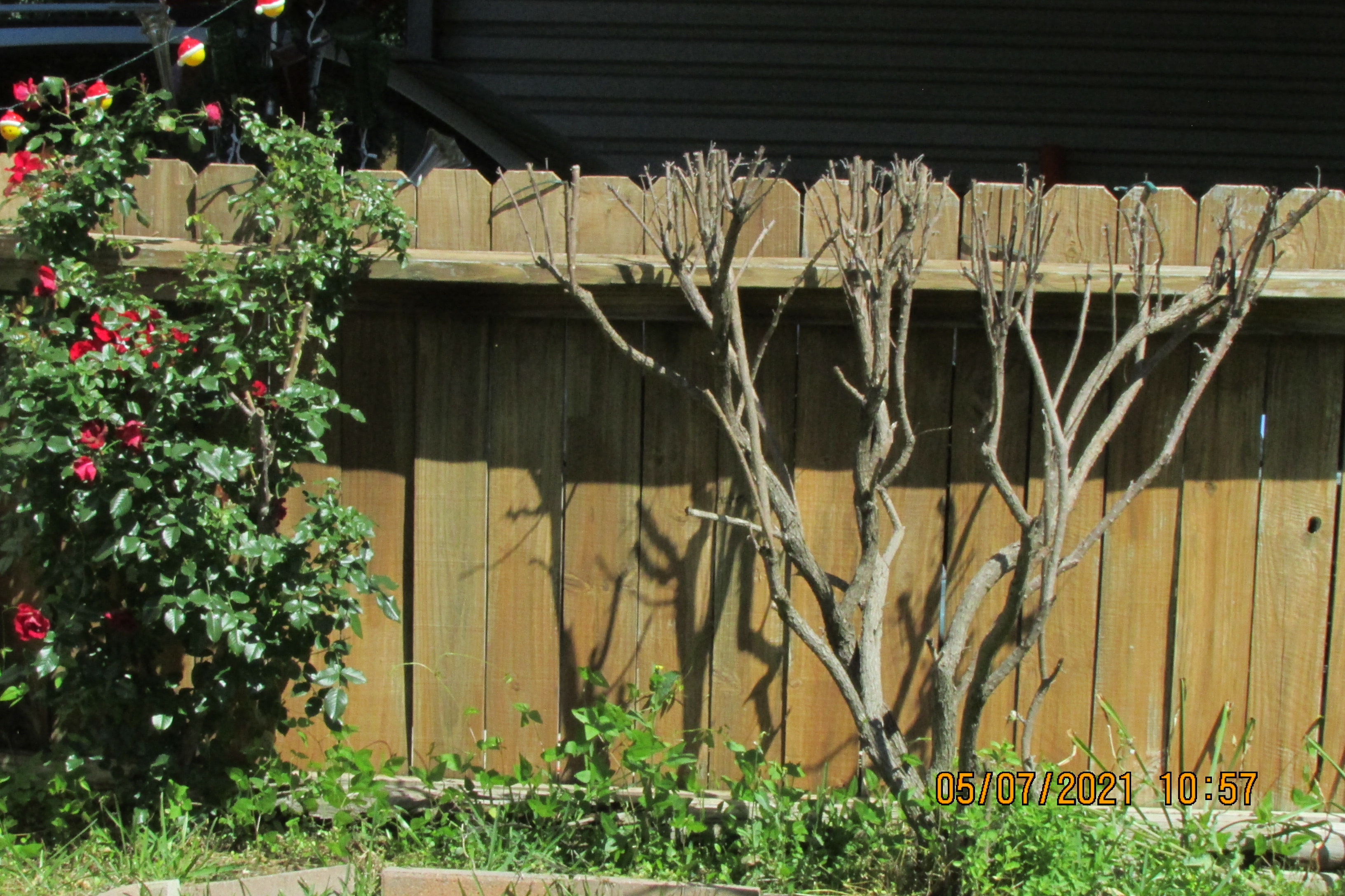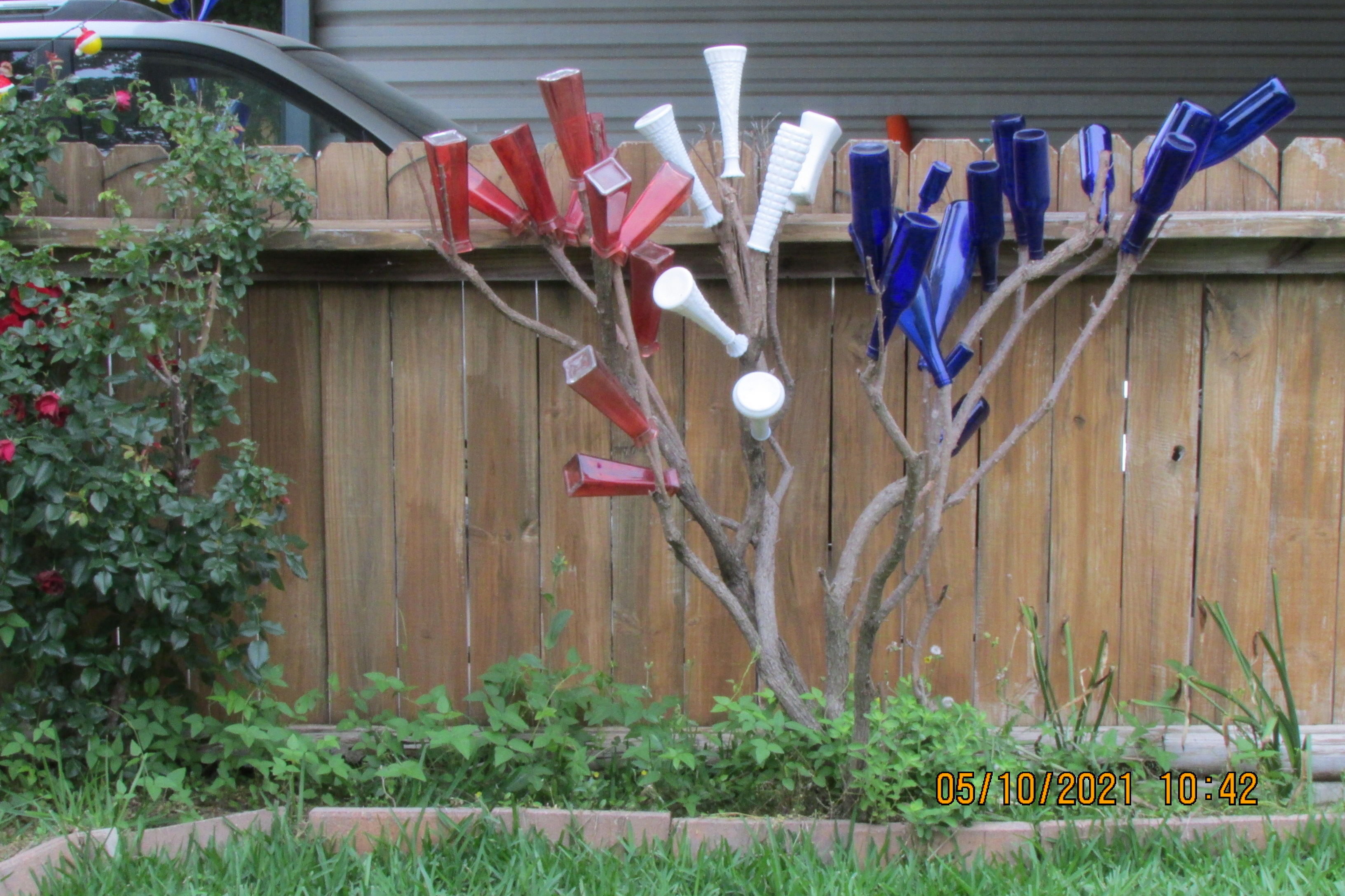 The bush died because of a hard freeze several years ago. I created the “bottle bush.” Over time, the limbs became brittle and broke off so fewer bottles. Yesterday, the bush finale.