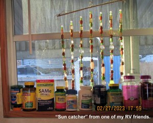 “Death of my art project” was offset by happy moments (and happy memories) observing the artwork of a dear RVing lady friend. The late afternoon sunshine illuminated my kitchen window—a rare treat.