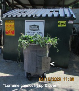 Postscript @10:30 AM: “My trash runneth over.” That is the second trash can full to the brim, pushed down, overflowing.