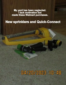 My “old” sprinklers had metal fittings. They fused to the end of the garden hose. The sprinklers were destroyed to remove them… This time I’ll use “quick-connect” and should be able to shuffle between hand sprinkler and oscillating sprinkler. ~~ “Twice in a while” I accomplish maintenance tasks.