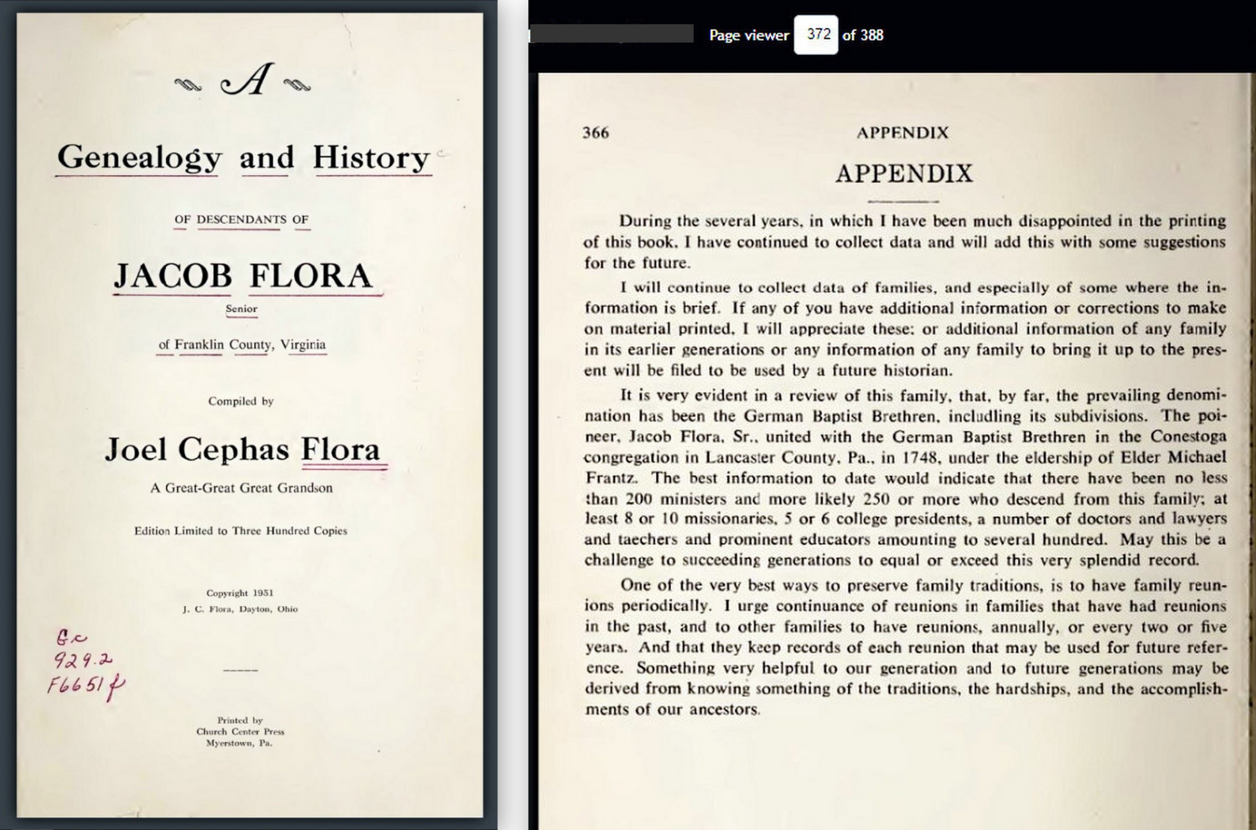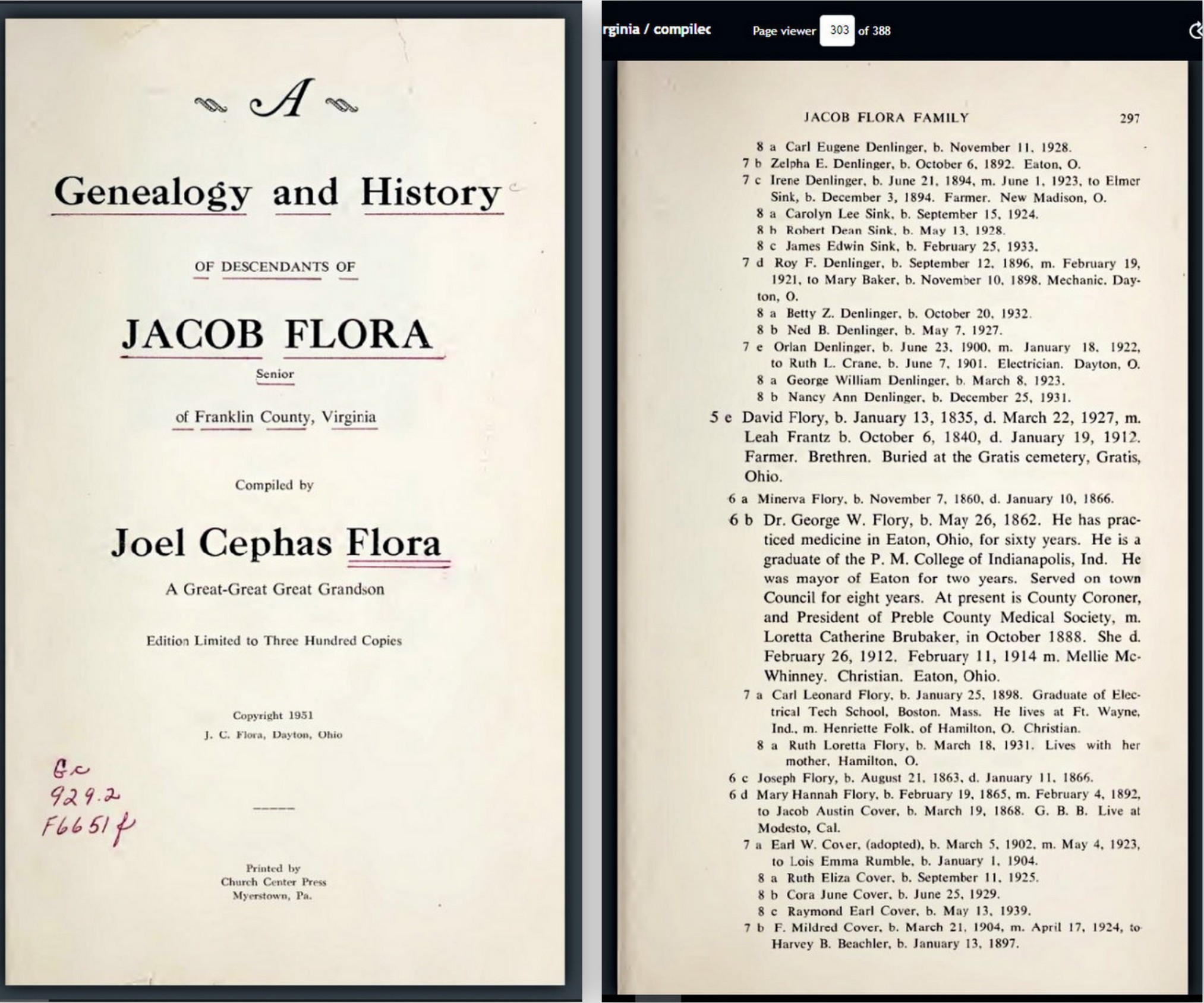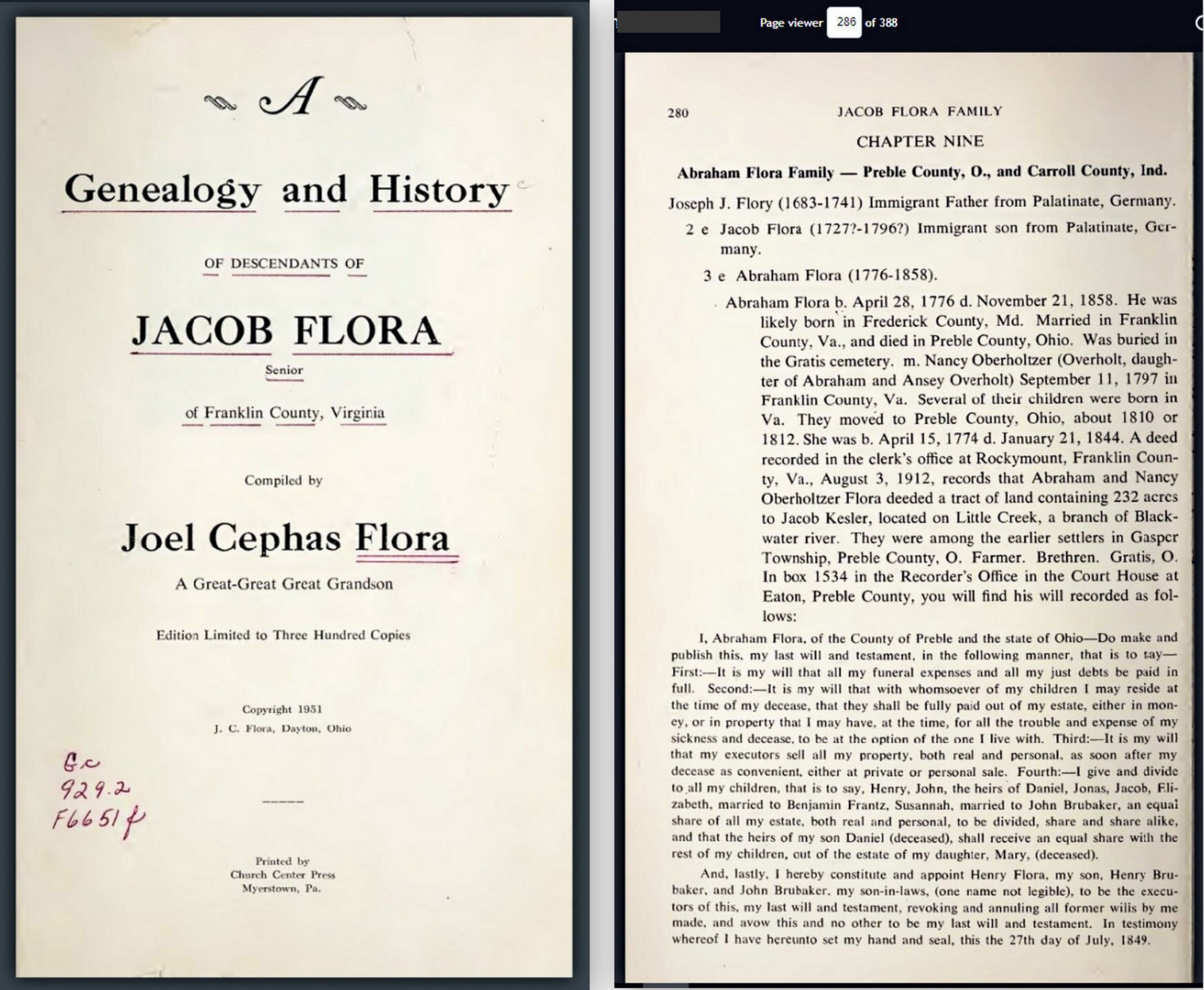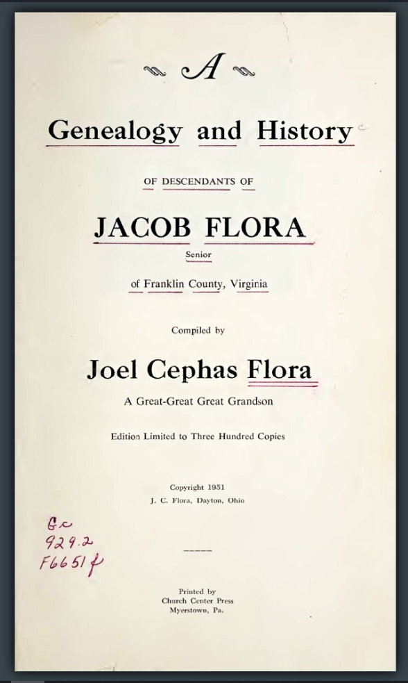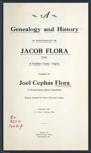 This researcher has refrained from terms like “can of worms” and “thick as fleas.” Today, I was in a peculiar set of circumstances and I had the inspirational thought “Briar-patch.” It was so complicated, I won’t even begin to explain… or publish an image. Changing the subject: I had a very rewarding experience when I searched for the book titled Genealogy and History of Jacob Flora of Franklin County, Virginia. It was available for viewing on FamilySearch, I scrolled through 388 pages. I made a “screen print” of pages with valuable to me information. I marvel at the volumes of family information, perfectly detailed, at a time prior to computers. In 1996, I published 3,180 pages–Frantz Families–Kith & Kin–but I had the benefit of a genealogy software program in a computer.