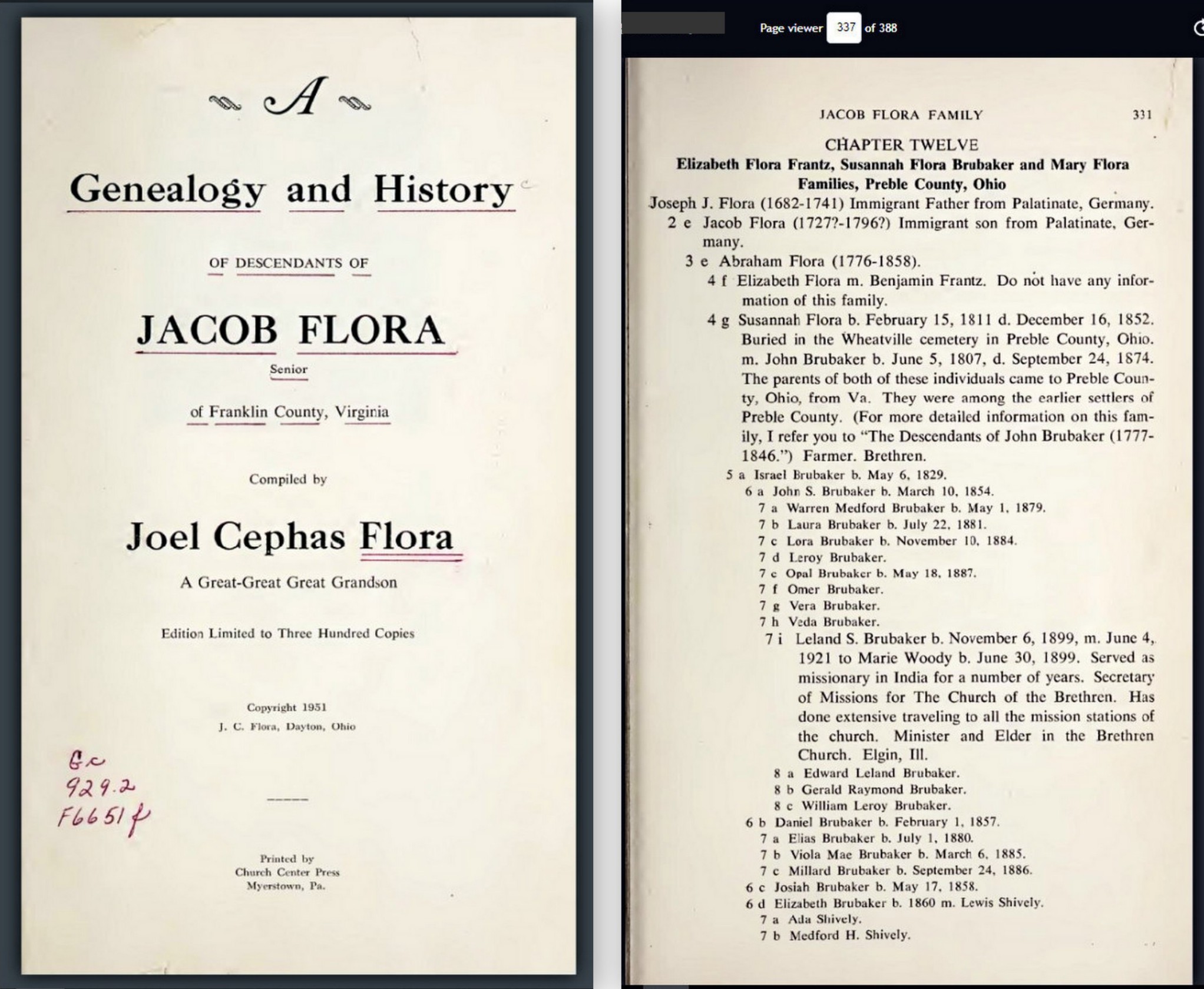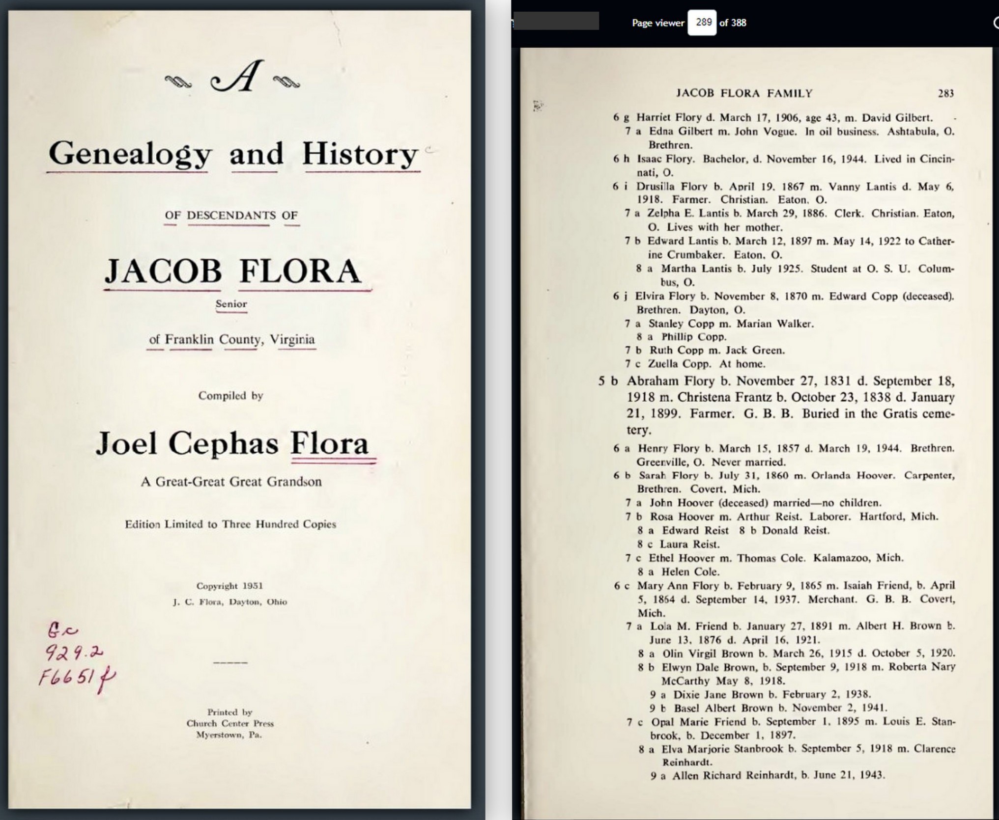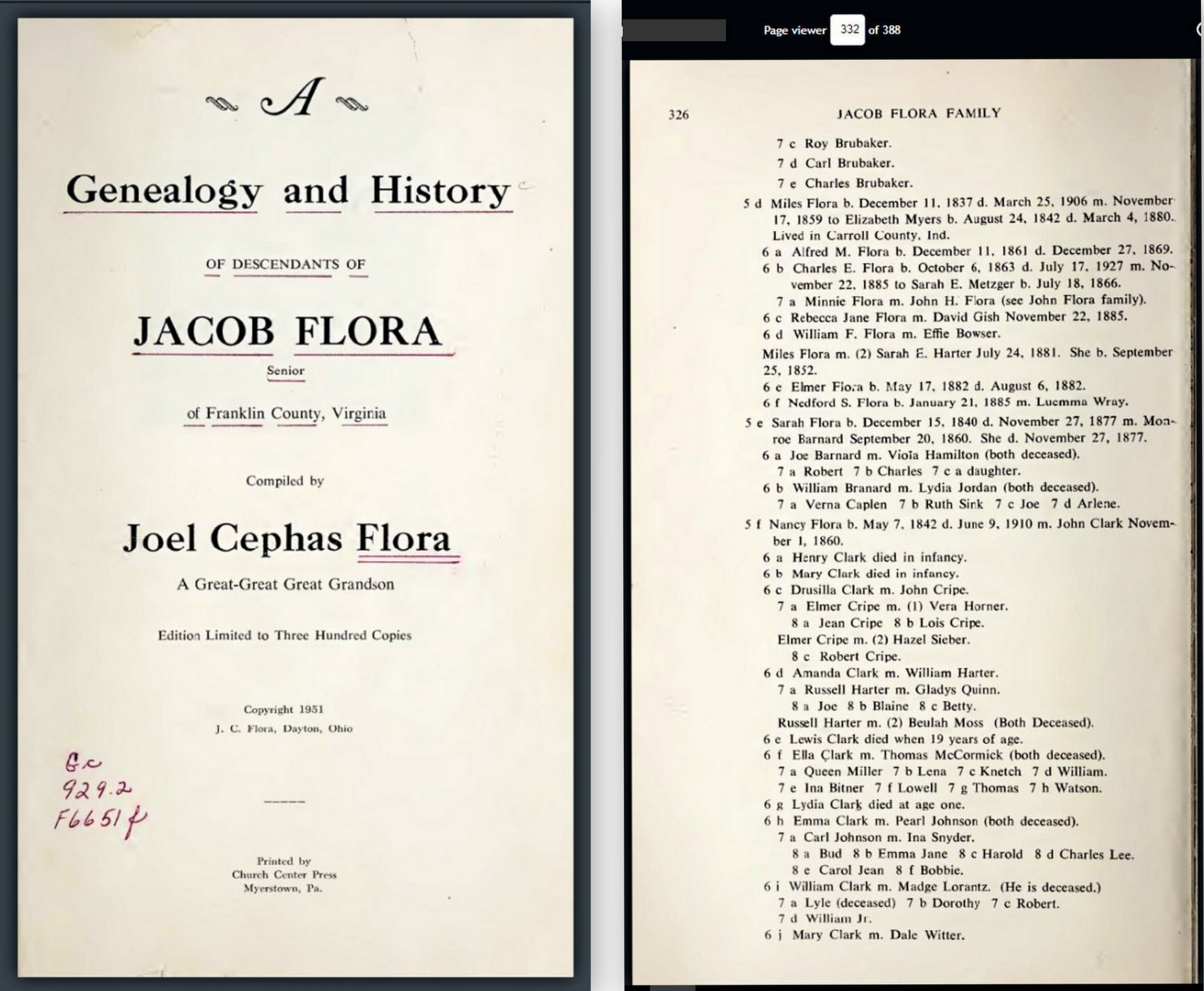 This researcher has refrained from terms like “can of worms” and “thick as fleas.” Today, I was in a peculiar set of circumstances and I had the inspirational thought “Briar-patch.” It was so complicated, I won’t even begin to explain… or publish an image. Changing the subject: I had a very rewarding experience when I searched for the book titled Genealogy and History of Jacob Flora of Franklin County, Virginia. It was available for viewing on FamilySearch, I scrolled through 388 pages. I made a “screen print” of pages with valuable to me information. I marvel at the volumes of family information, perfectly detailed, at a time prior to computers. In 1996, I published 3,180 pages–Frantz Families–Kith & Kin–but I had the benefit of a genealogy software program in a computer.