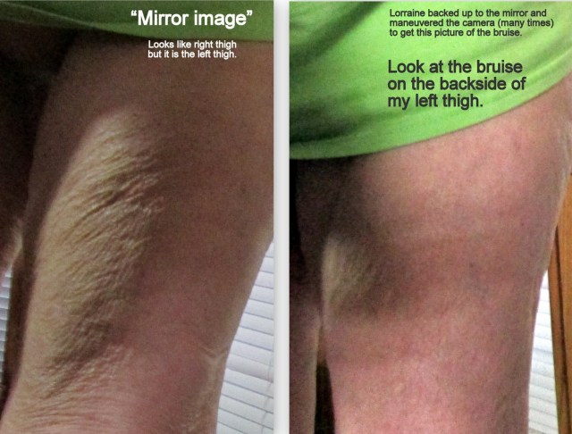 I was curious: “Is there a bruise?” After a dozen pictures, I had images that illustrate the bruise. It wasn’t easy to get a picture of my backside because the camera was at arm’s length (in front) and aimed at the leg while I was standing in front of the mirror. ~~ I’m in pain, and I’m still hobbling around with a cane.