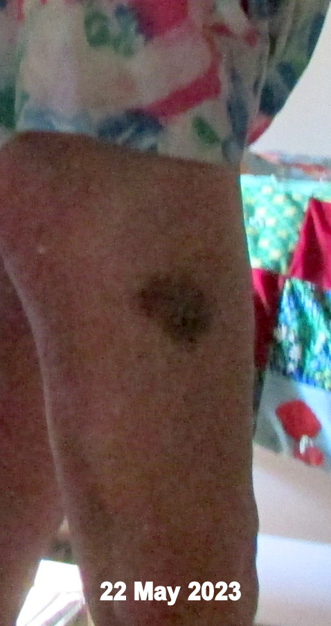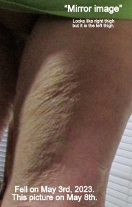 First: The “mirror image,” today, and it appears as though my right leg but it’s the left leg. Second: Obviously, there has been an improvement… Yesterday I took five steps without the cane. Fearful of falling, I still have the cane within arm’s reach. I’m better and praising God!!
