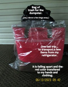 Have you heard that old saying? It relates to the farmer butchering the hog. From my recent pictures, you might think Lorraine saves everything. Well “almost everything.”  The thermal bag will be used one more time. It is falling apart (from old age, like Lorraine). It’s a “dreary” day, with no sunshine, honestly portrayed in the pictures of my yard. A “dreary” day because I hate to give up my independence.