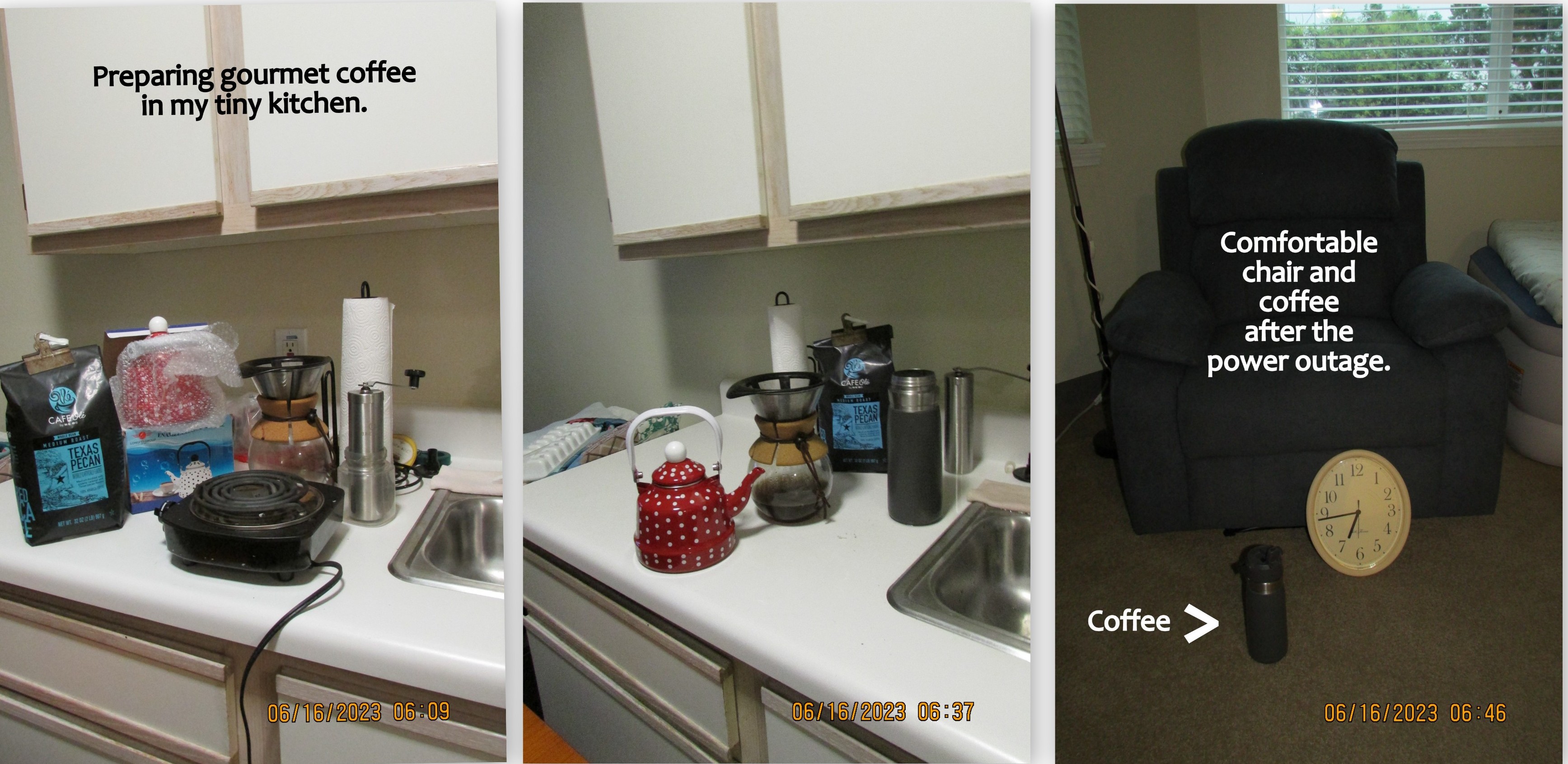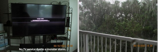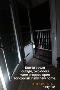 Another quote from an earlier message: “I’ll ‘fast forward’ to the late afternoon when we had a monster rainstorm with enormous bolts of lightning close to our building. First, we lost the TV signal, and minutes later we lost electricity. My apartment became very hot, very quickly because no A/C. I checked the corridor and neighbors were standing, or sitting, in their doorway because the corridor had lights and A/C. I heard voices in the lobby area so limped down the stairs and joined the group. When folks headed back to their apartment, I too, headed to mine and went to bed. (Climbed the stairs for the second time…) Before ‘bed,’ I opened the door to the balcony, and the storm door, and propped them open so I had cool air inside my apartment. The power came on about midnight—but no TV. I haven’t heard details on TV news but I suspect it was an area-wide power failure.”