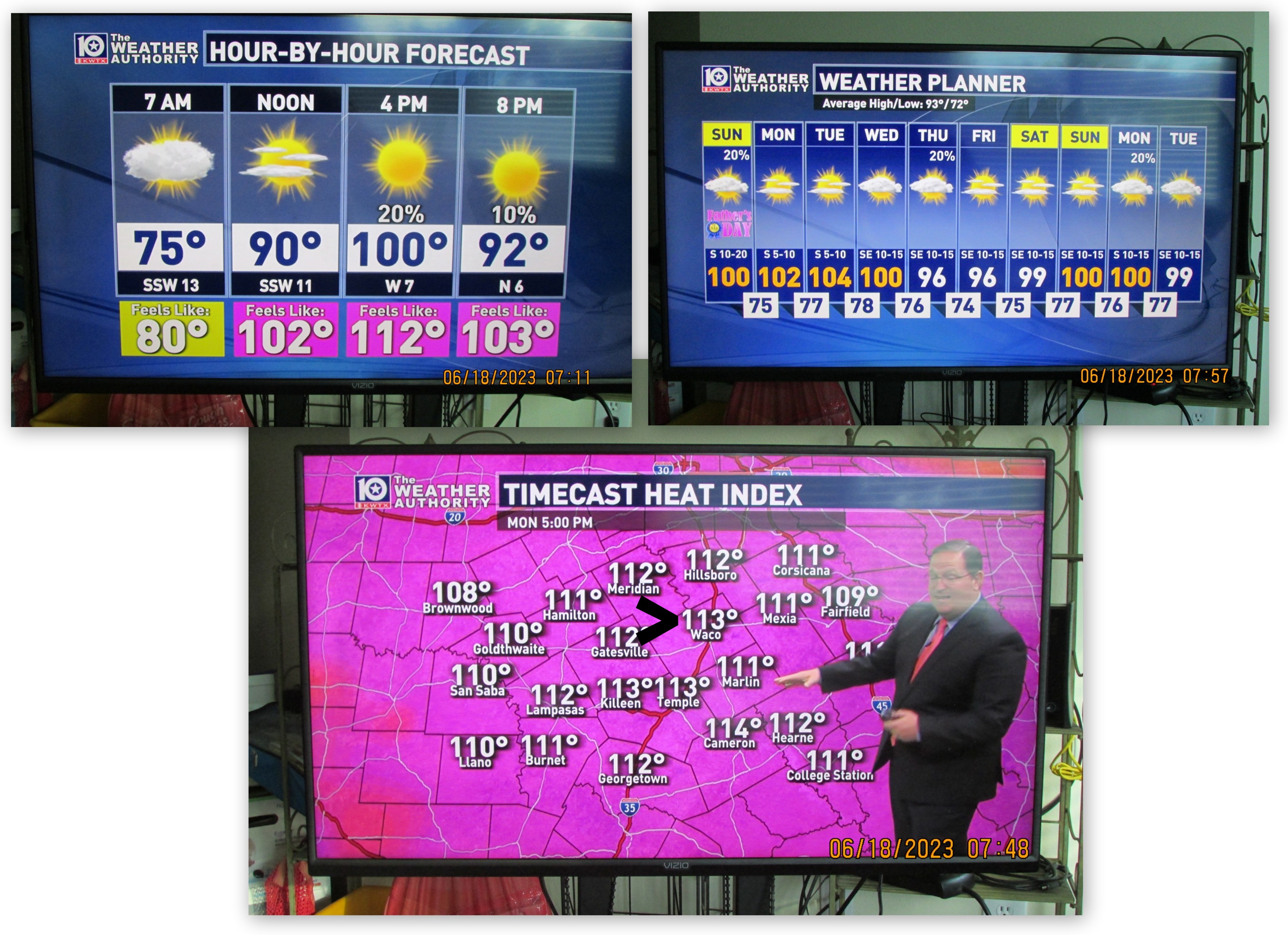 Early on this Sunday morning, I located the computer keyboard (buried in stuff in the bedroom) and began the process of hooking up the monitor and keyboard to the CPU. Little by little things were accomplished. First: Checked my email. Second: Gratefully, I was able to download (upload?) the pictures from my camera to the computer. Third: The ability to reach WordPress and publish this blog message. Note our extremely hot weather in Waco. More pictures and details about my move will follow.
