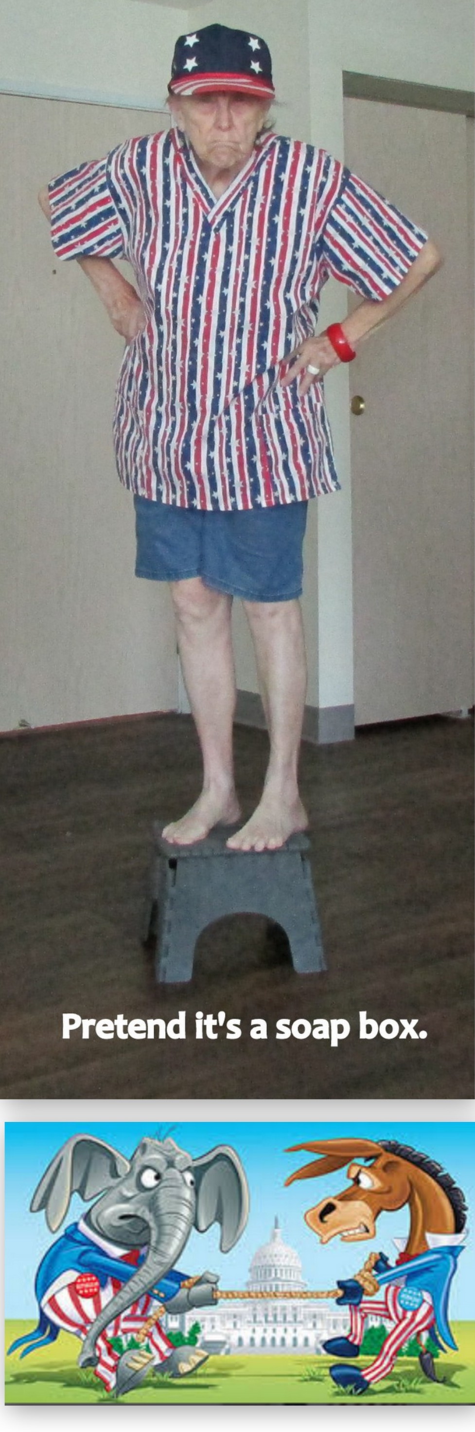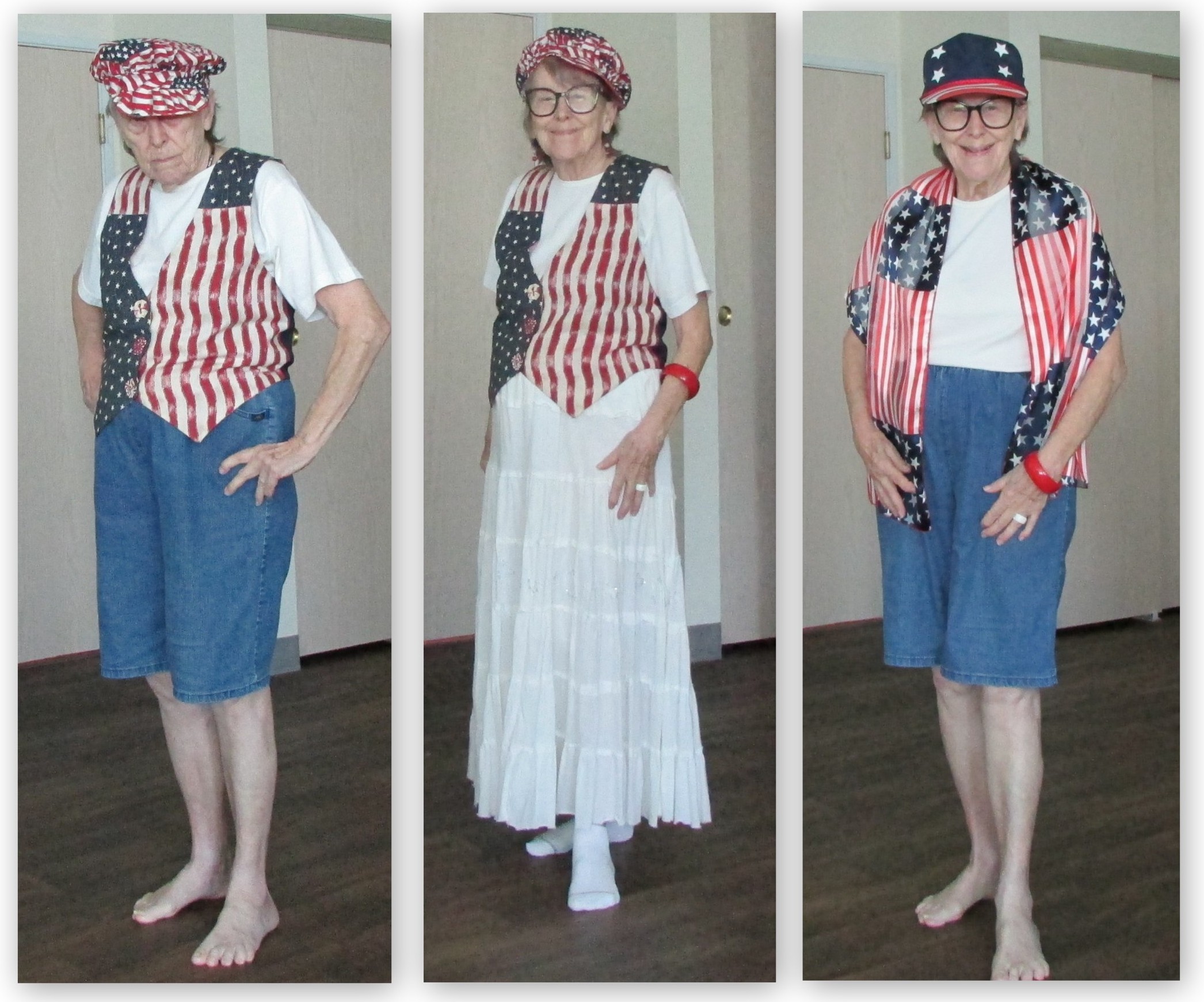 I’m not a model but “modeling” my patriotic outfits was fun. I’m wearing red, white, and blue every day this week. Strangely, my “patriotism on display” seems to annoy some of the vocal Democrats. “They” have already (with disgust) identified me as “Oh, you are one of those Trump supporters.”