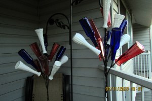 When it is cooler, perhaps this evening, I’ll put the bottles and vases on two hanging displays. At my other location (if you remember?), there were three and I had red, white, and blue on separate frames. I’ll mix the colors here because I only have two hooks (to hang from). ~~ On Sunday, a young couple looked at my trailer home and, spontaneously, offered to help me take down the bottles.