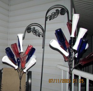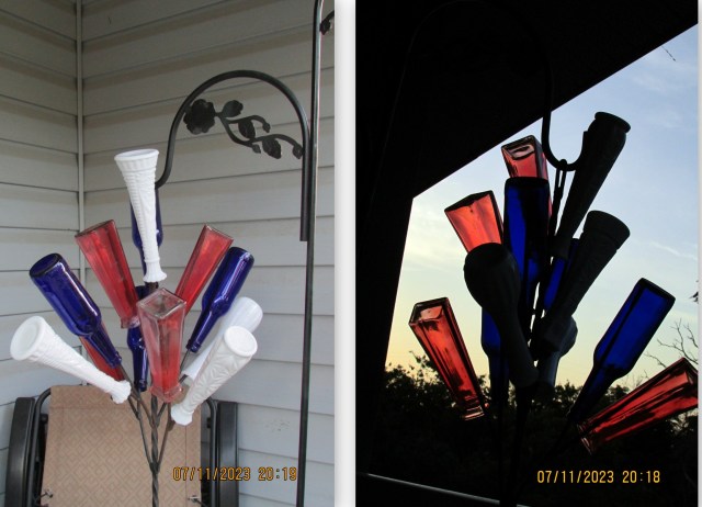 When it is cooler, perhaps this evening, I’ll put the bottles and vases on two hanging displays. At my other location (if you remember?), there were three and I had red, white, and blue on separate frames. I’ll mix the colors here because I only have two hooks (to hang from). ~~ On Sunday, a young couple looked at my trailer home and, spontaneously, offered to help me take down the bottles.