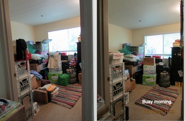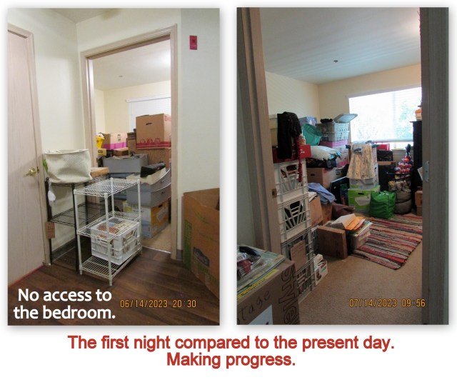 “Inch by inch, it’s a cinch” Jul14 by Lorraine Frantz Edwards Observe pictures on my one–month anniversary. I’m displaying evidence of my “getting settled” progress. “Yes,” I emptied all those crates. POSTSCRIPT @ 12 noon: A busy morning. Share this: Click to share on X (Opens in new window) X Click to share on Facebook (Opens in new window) Facebook Like Loading...