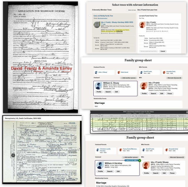 Ancestry subscribers had repeatedly listed incorrect information. It took several hours to collect the information and then create the collage. Ancestry recently made a change to formatting. Perhaps the change is meant to force subscribers to document sources–and not copy from another subscriber. Personally, I don’t “copy” and the change makes twice as much work for me. With this family, there were numerous errors that I wanted to correct. One major frustration: David Frantz’ grandfather and ancestry is unknown. I did thorough searches without success. All that work (ha) and I don’t know if they are cousins.