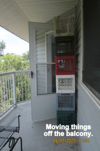 I moved things off the balcony because the building is receiving a new paint job. ~~~~  OMG!! About one hundred things to move in one-hundred-degree heat!!