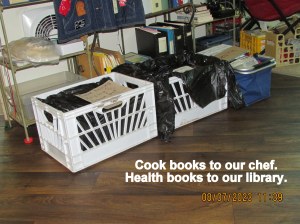 Our Chef collects cook books so one more crate will soon be empty. The second crate has superiorquality health books en route to our library. ~~ “No,” the books were not on the balcony. I moved them from the bedroom / “storeroom,” to the kitchen/entry area, in preparation for a trip down the corridor to their respective new homes.