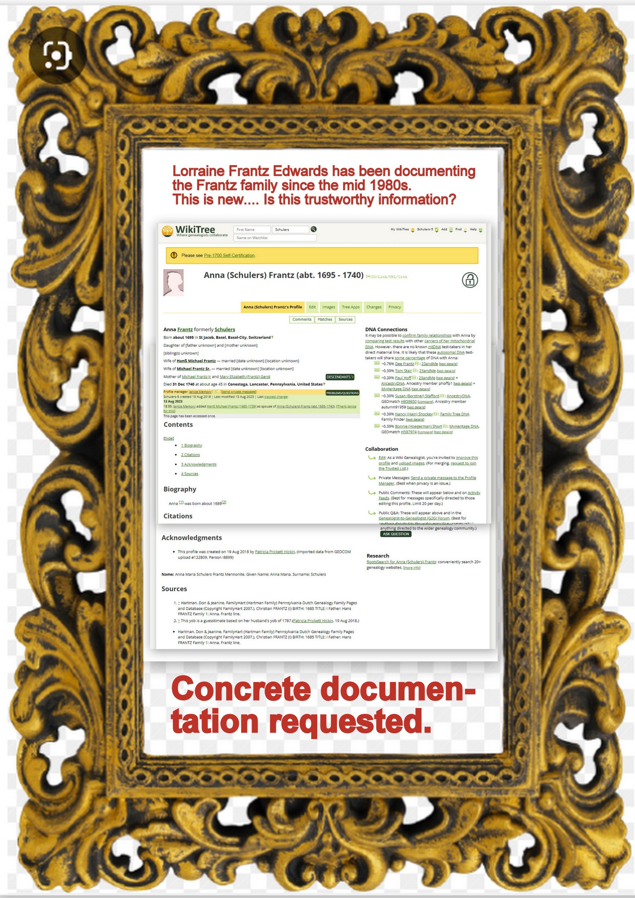 Leland, last week I sent a private message to the project manager about John Frantz that she had listed as the son of Michael Frantz and Magdalena Zug. I directed her to my tree but I don’t know if she looked at it. That John Frantz was NOT the son of M & M. Now, today, she has the supposed wife of Michael Frantz and mother of Michael Frantz II. But plain as day, her sources were loaded with “unknown.” Things like that prompt me to create an image that is sure to attract attention. FYI: There were researchers who did due diligence long before I came on the scene in the mid-1980s. Their research is well documented in Frantz Families–Kith & Kin (with sources). There was no information (known to me) with the name of Michael’s wife. The supposition was that she died during the voyage–supposition by all those scholarly Brethren devoted to documenting their very early itinerant preacher Michael Frantz (1687-1748). Leland, the early Brethren don’t get the recognition of Martin Luther, or Calvin, but Alexander Mack and Michael Frantz were part of the revolt against the Catholic Church.